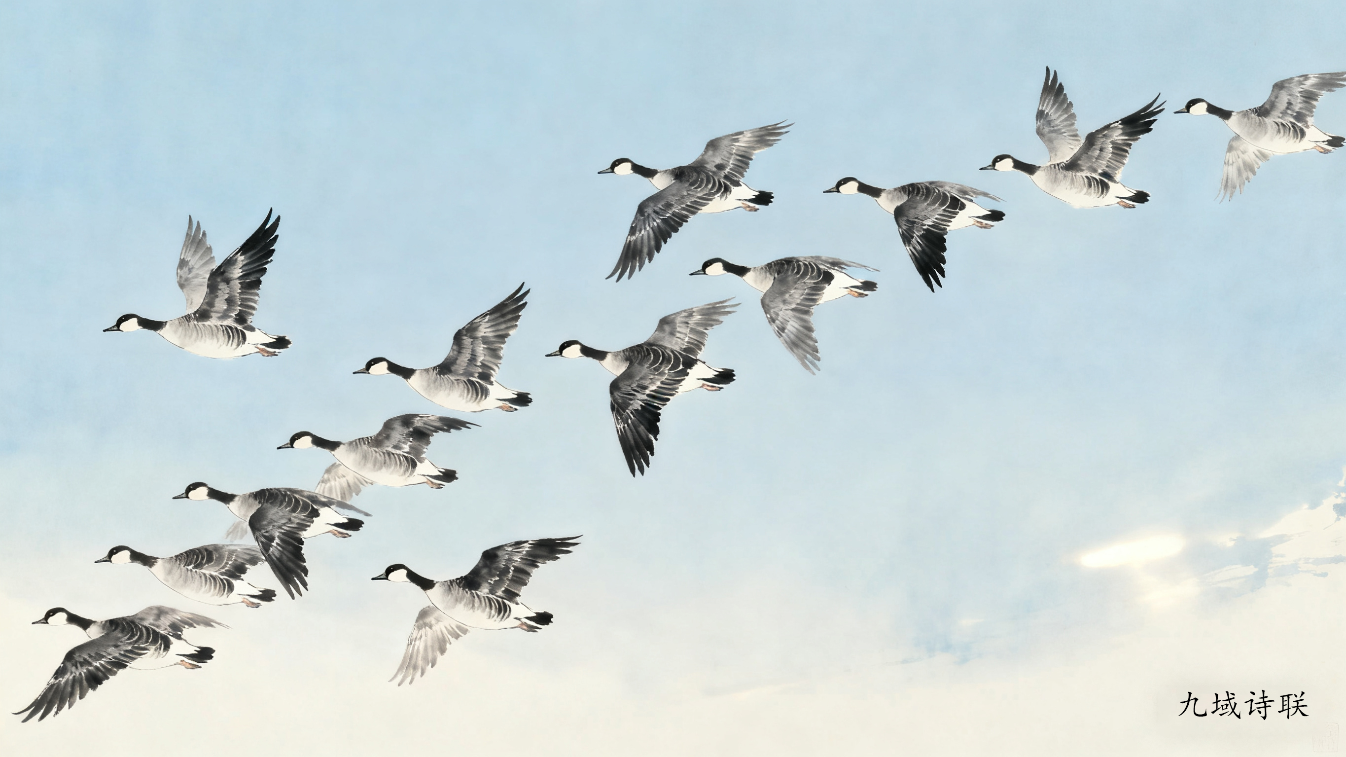 山青水澈, 北雁南征,一羽傲云天, 彩韵飞扬风送爽;
