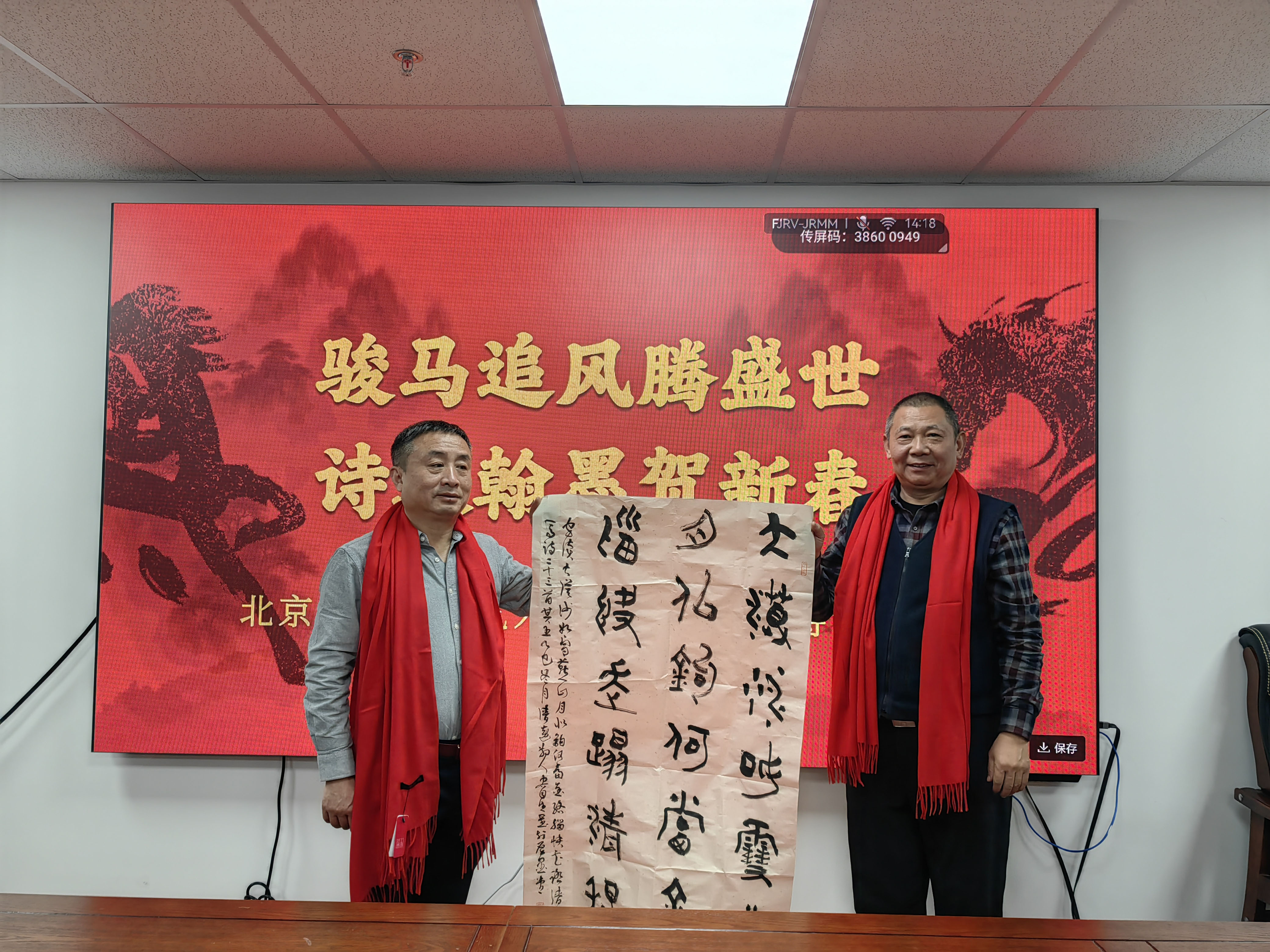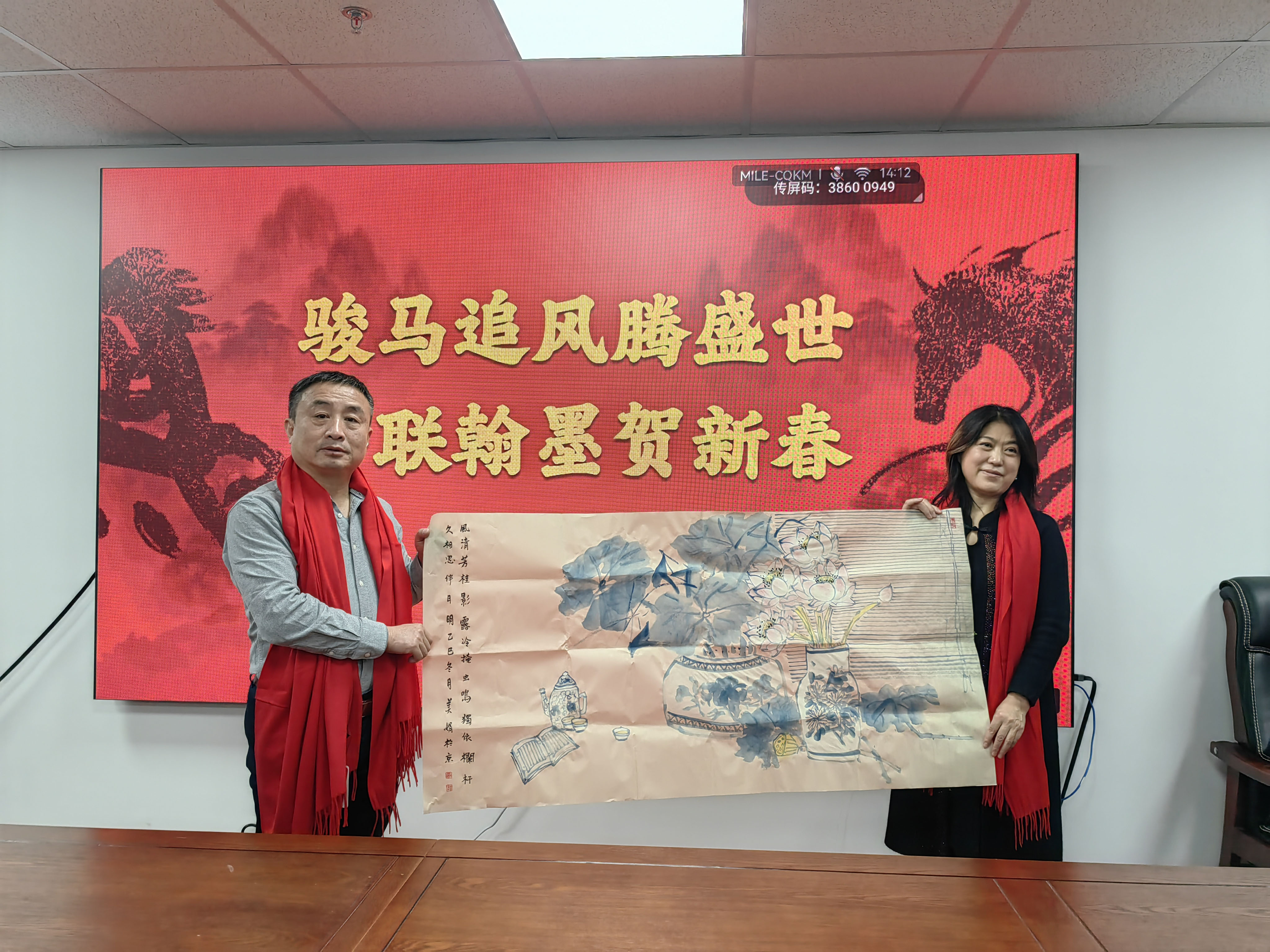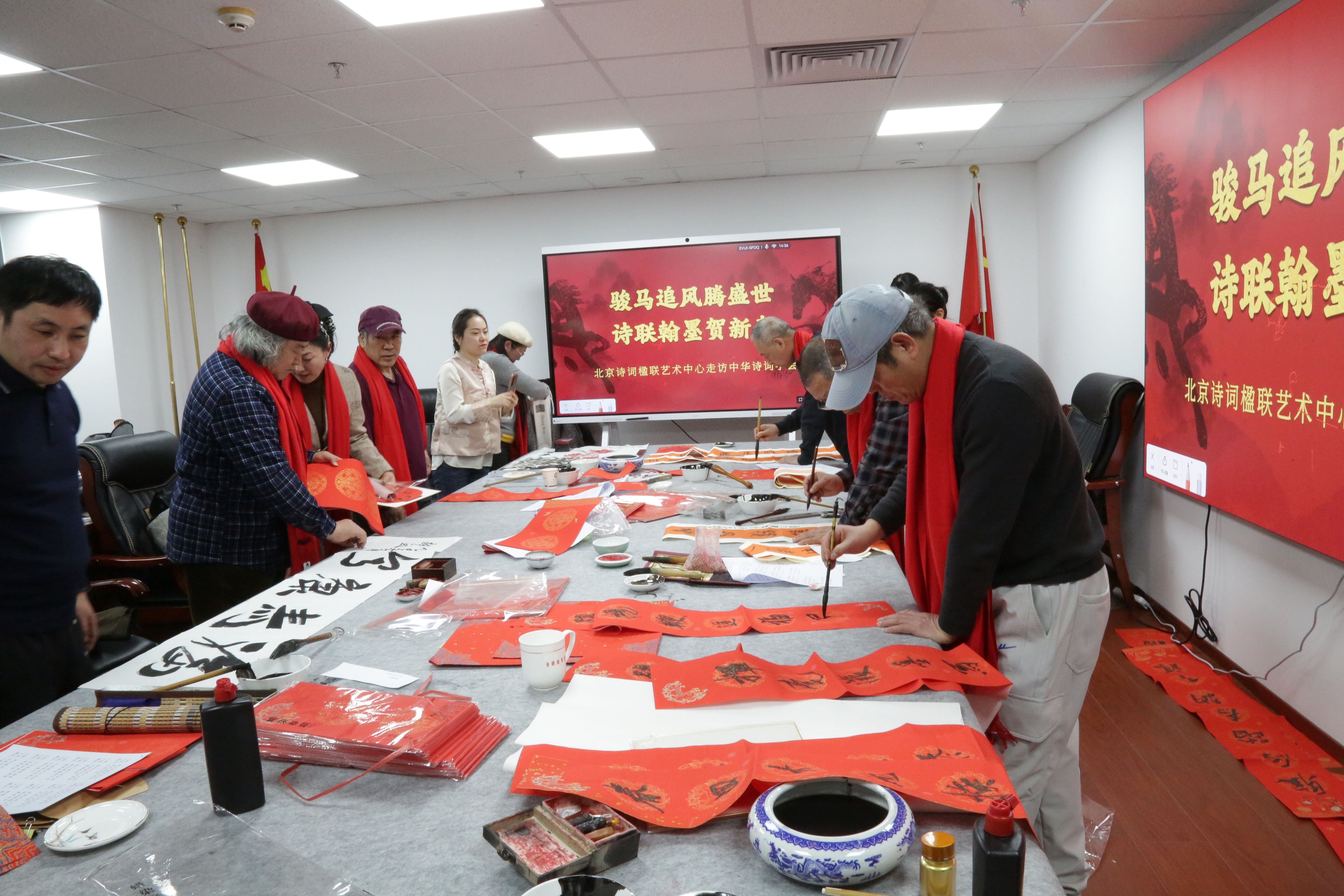 岁聿云暮,翰墨迎春。在马年新春佳节即将到来之际,由北京诗词楹联艺术中心理事长闫丽伟、办公室主任王子卿、常务副主任刘清沧带队的书画界艺术家一行20人,于1月12日下午走访中华诗词学会,开展“迎春送福”文化联谊活动,艺术中心秘书长吴明礼、运营部主任王艳及相关工作人员参加。中华诗词学会秘书长杭中华、办公室副主任薛玉忠以及学会机关、《中华诗词》杂志社的人员热情接待并参加了上述活动。
