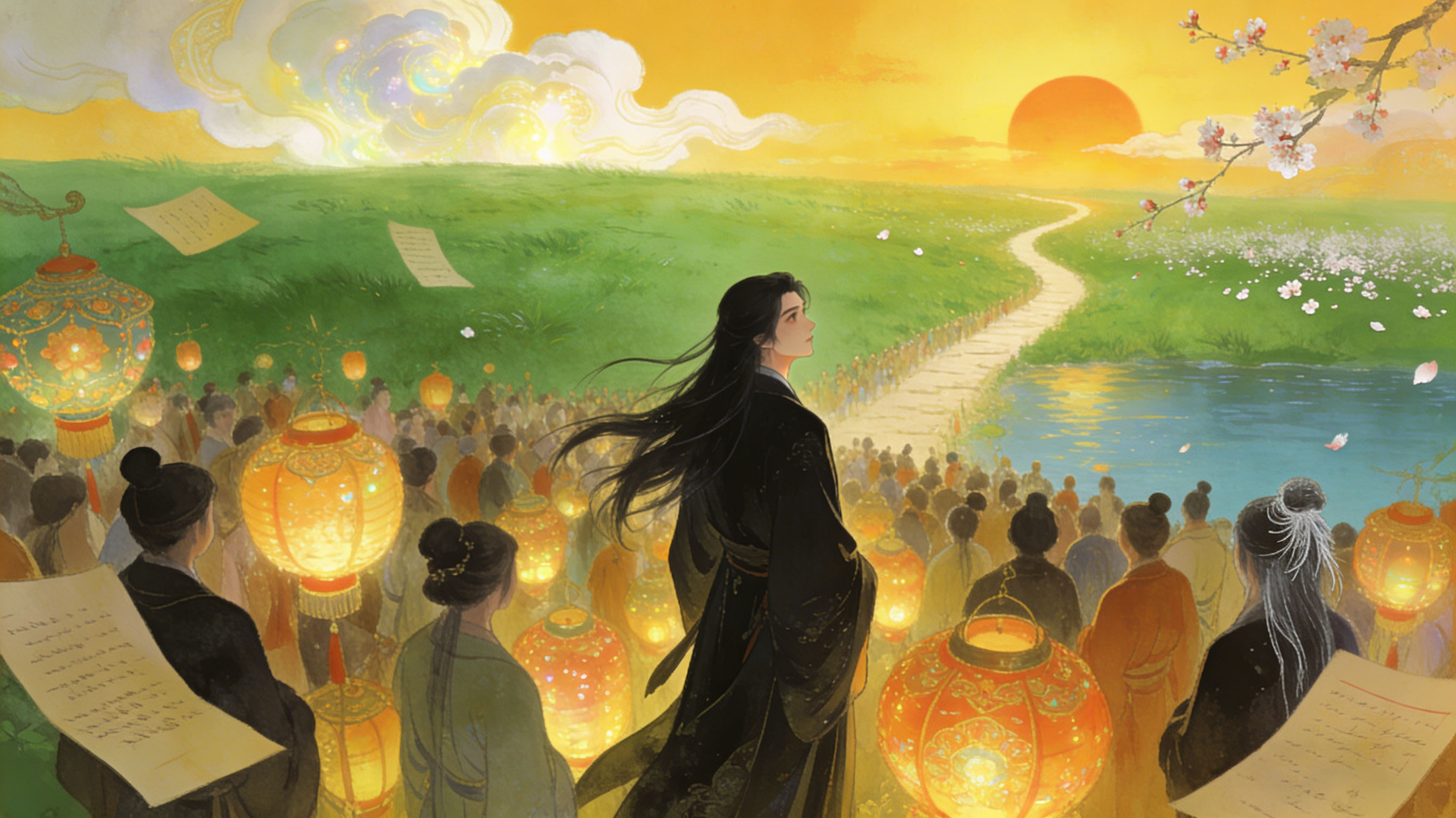 翡翠铺茵,瑶灯溢彩,客潮如堵。幽人独立,乌发风中飘舞。近黄昏、波横秋水,盈盈望眼斜阳路。似梓乡久别,归来情怯,怅然凭伫。