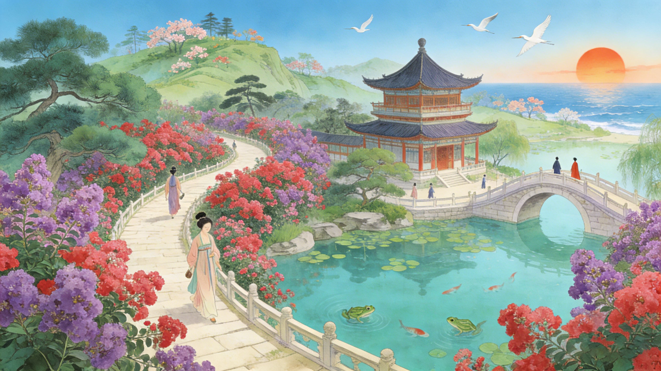 枸那暄妍,紫薇堆锦。嫣红满目,霞氛盈道。曲径旋回,翠云蒸蔚,抬眼乍惊妖娆。濒水华楼立,塘清碧、沉鱼姿俏。拱桥横影、佳丽匆匆、蛙鼓频噪。