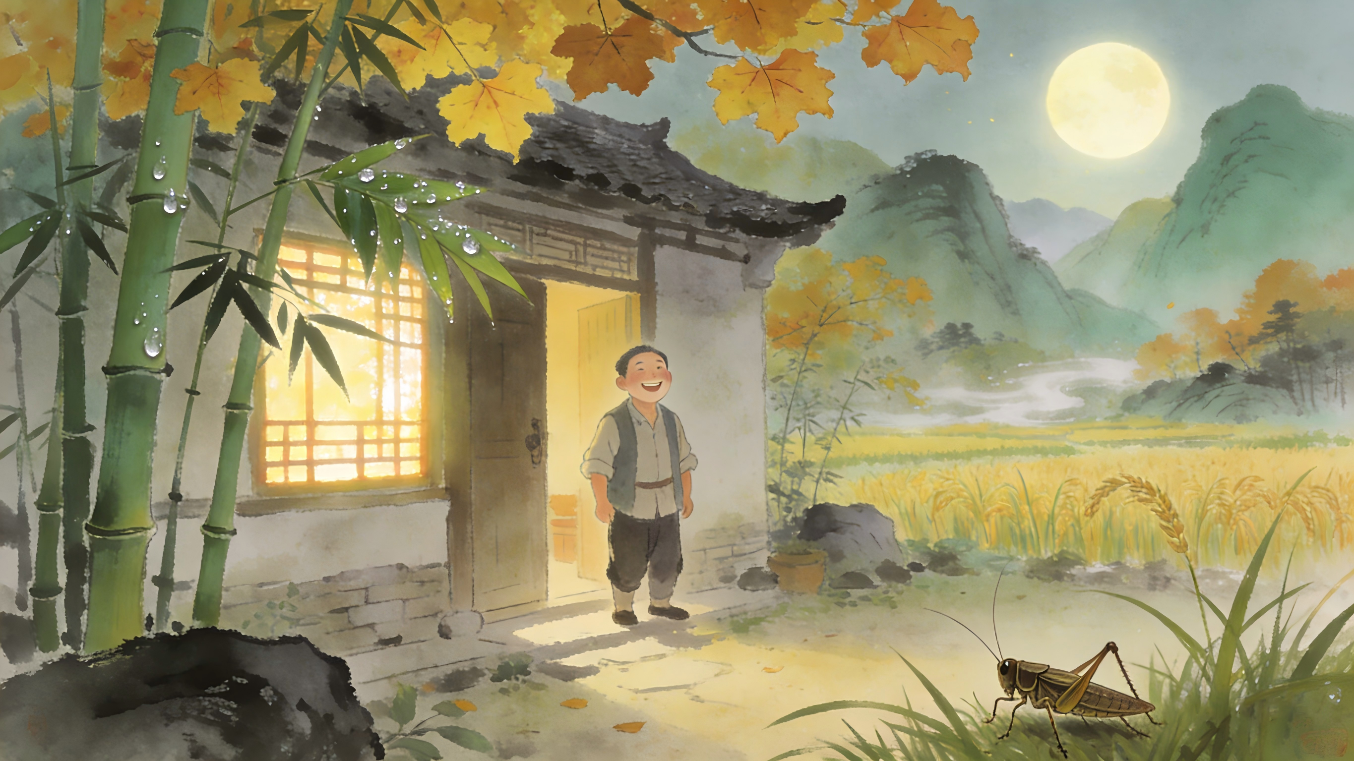 蛙鼓喧稻畦,雨滴敲荷朵。麦浪翻金穗渐沉,笑在眉弯卧。