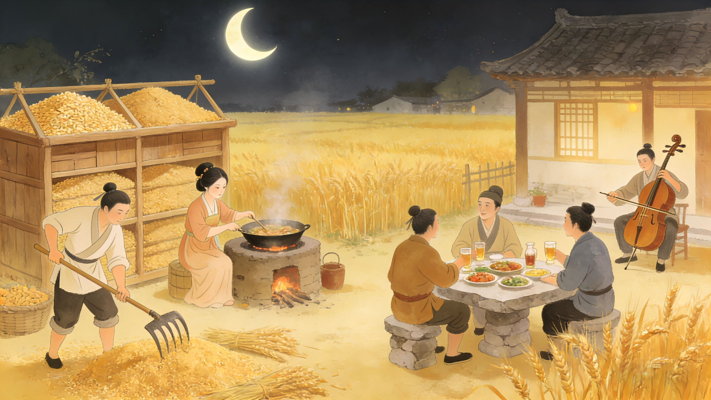 欢宴邀新月,弦歌动四方。