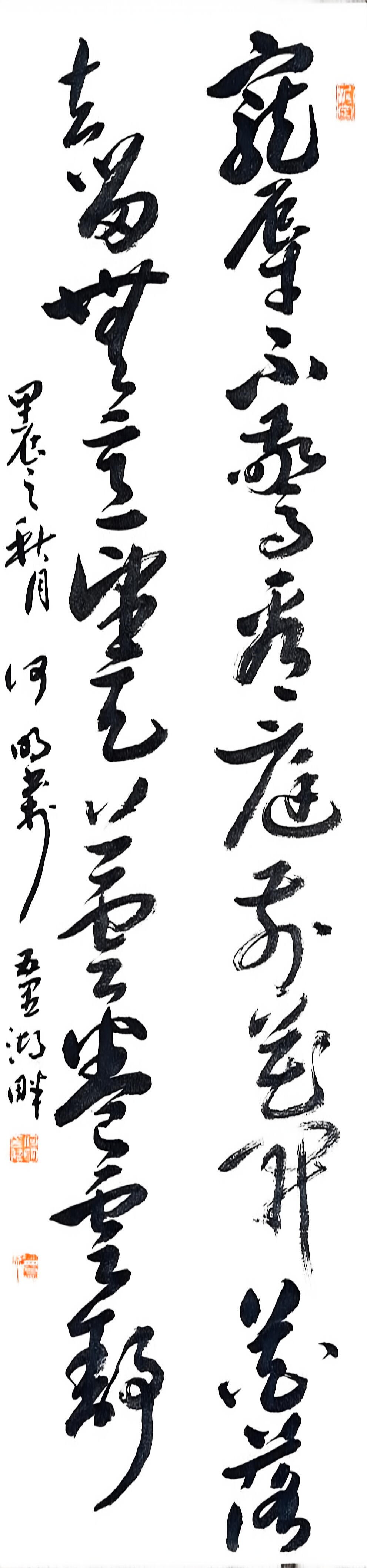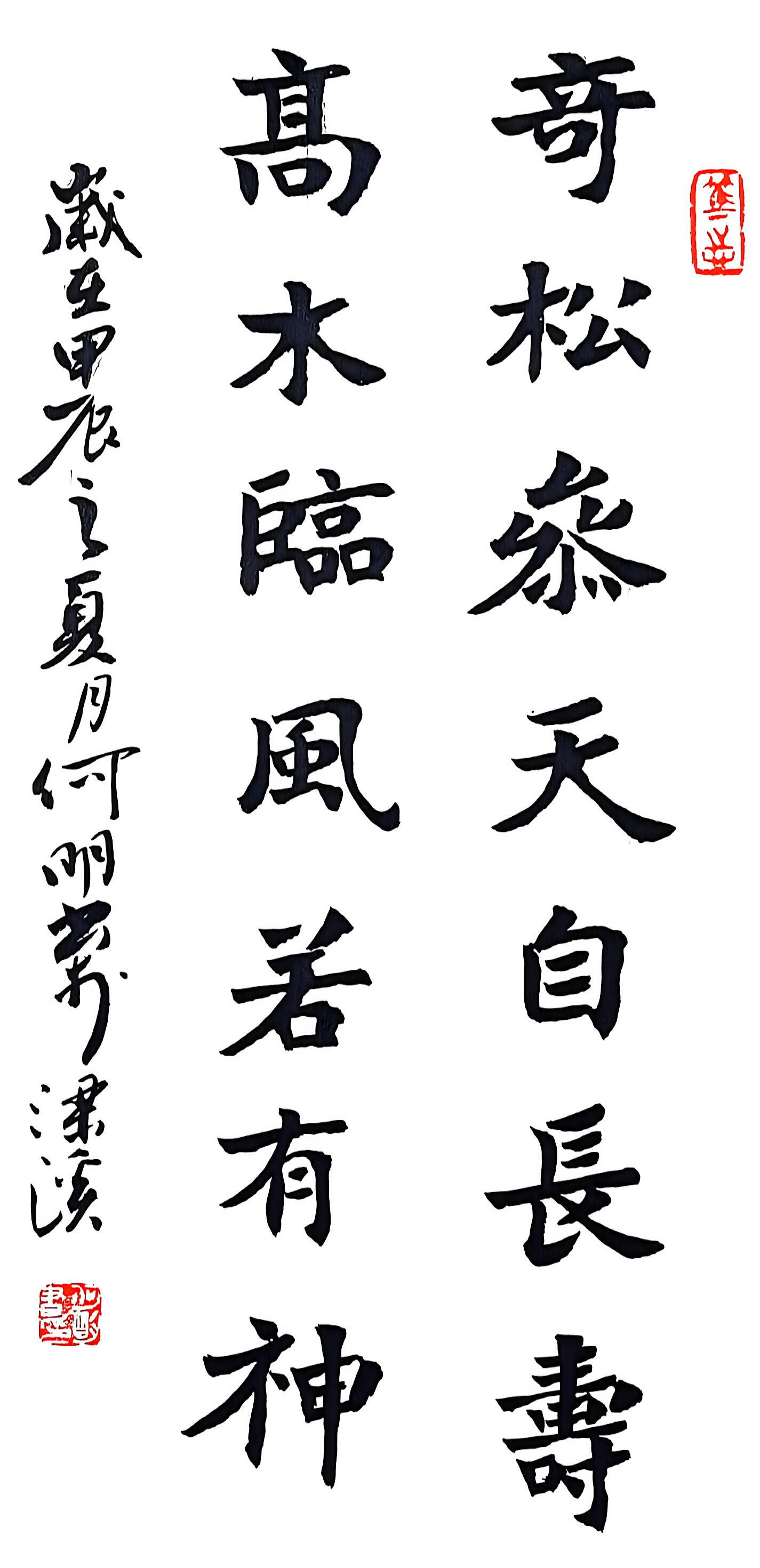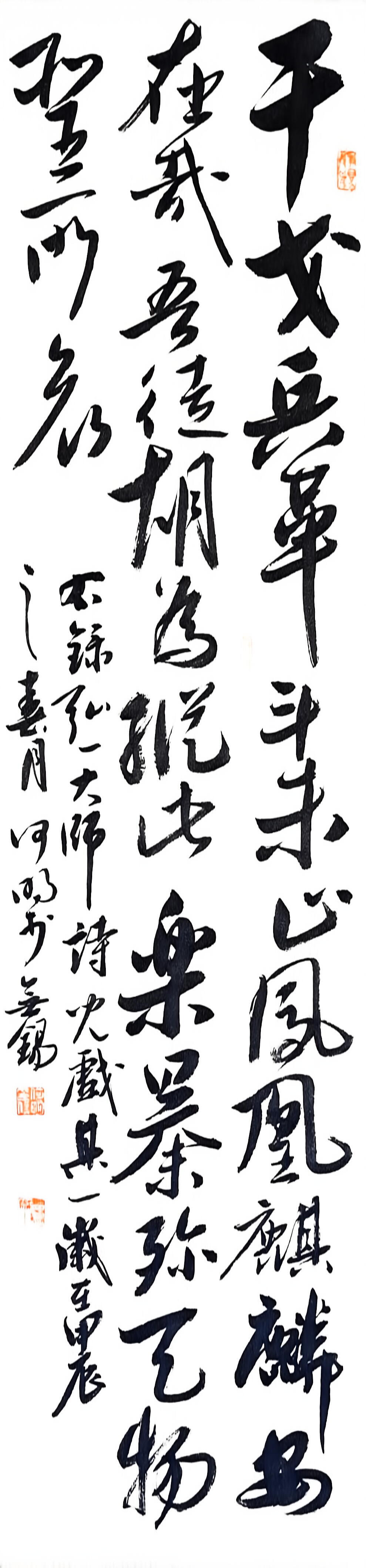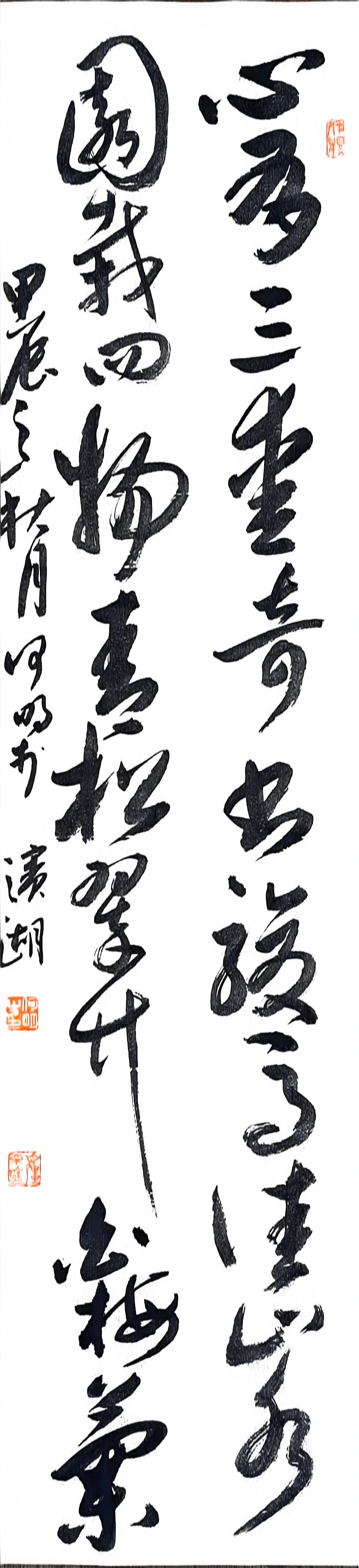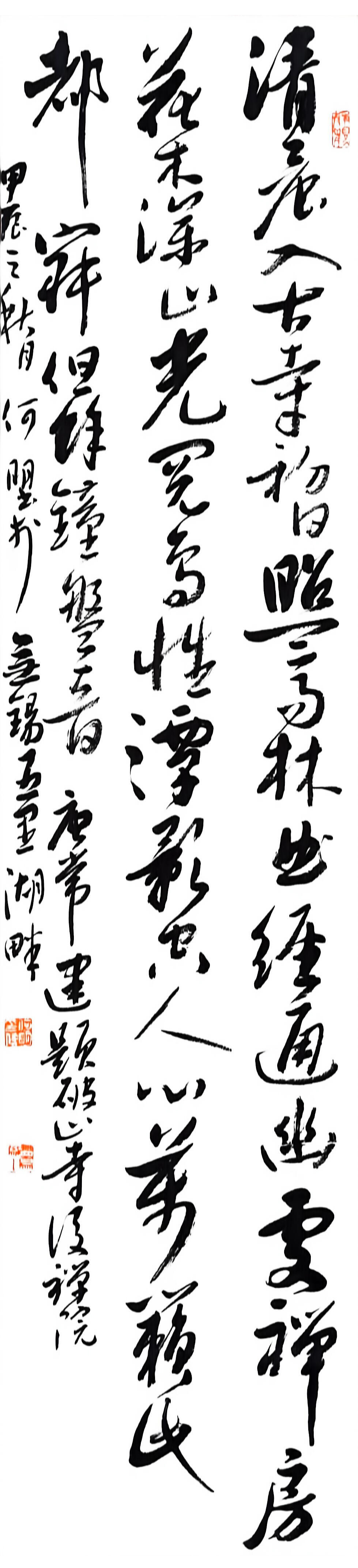 在书法创作上,何明深耕传统又勇于创新,博采众家之长,将历代名家笔韵与自身风格相融,形成了兼具传统韵味与个人特色的书风。他格外注重作品的内在气韵,精准把控笔法、墨色、章法,平衡传统与创新、刚与柔、虚与实的关系,让笔墨层次丰富、意境悠远。