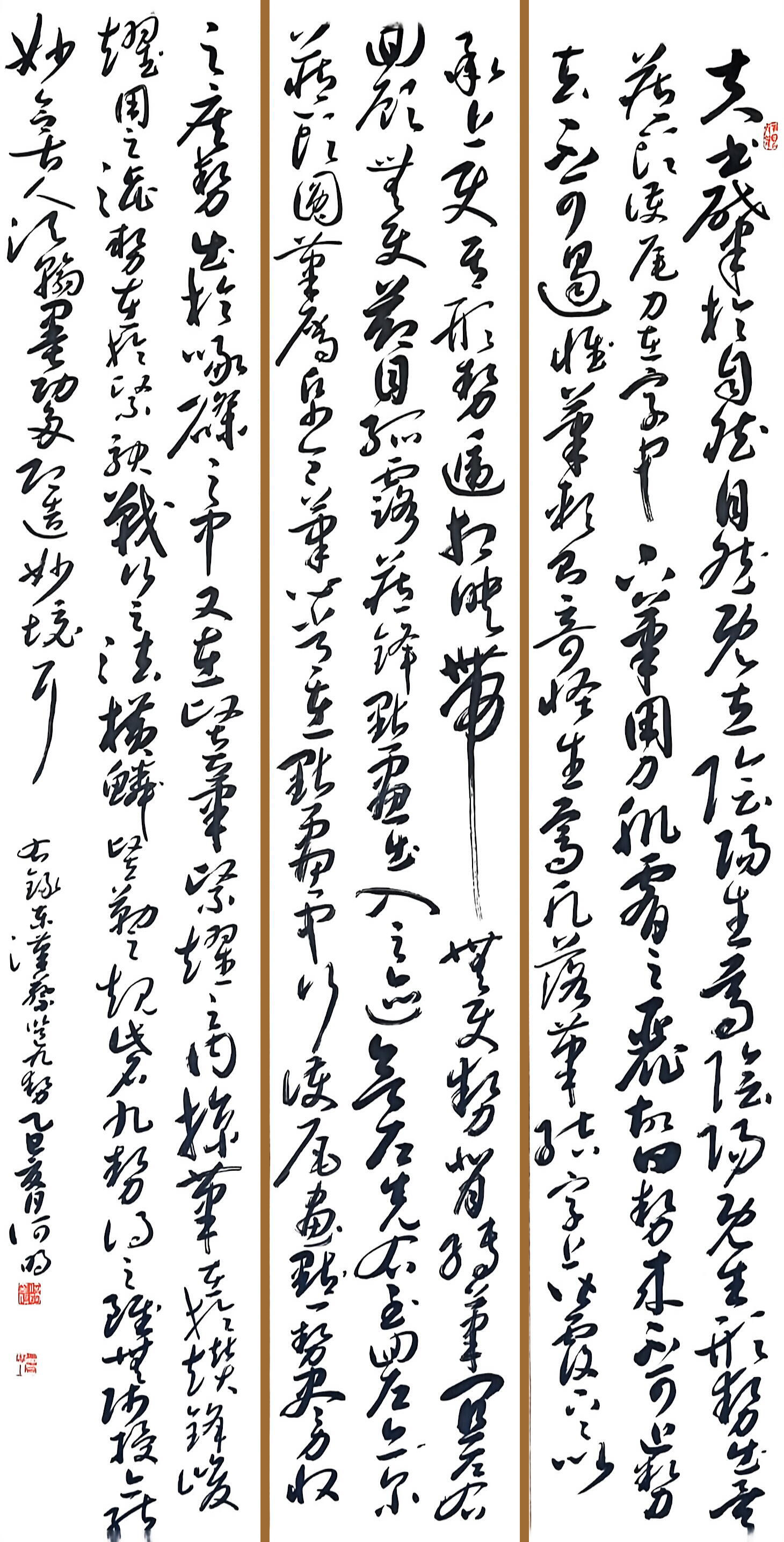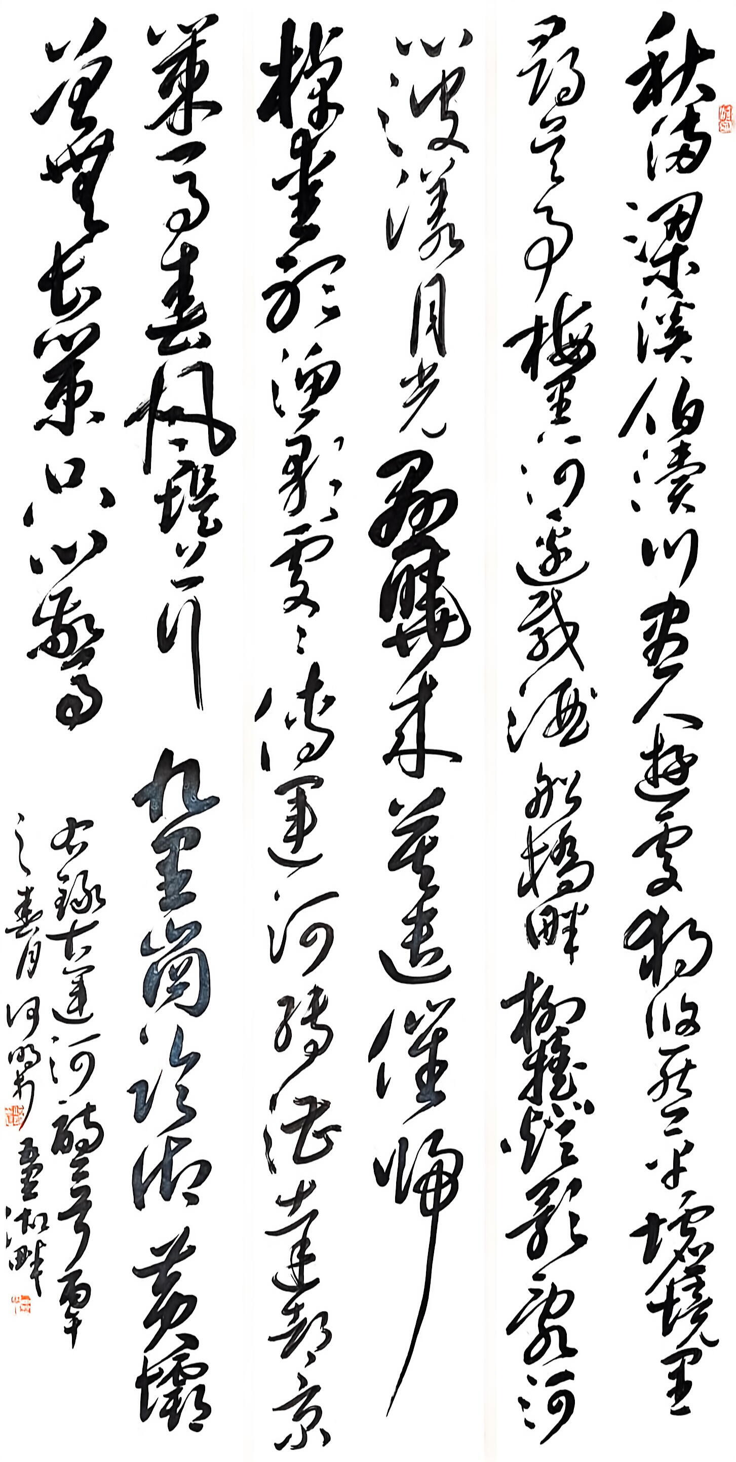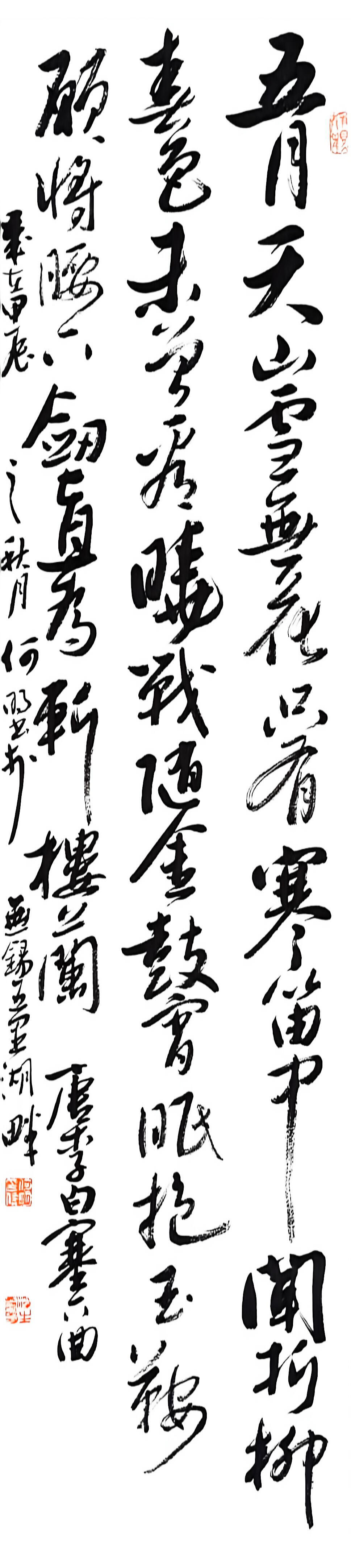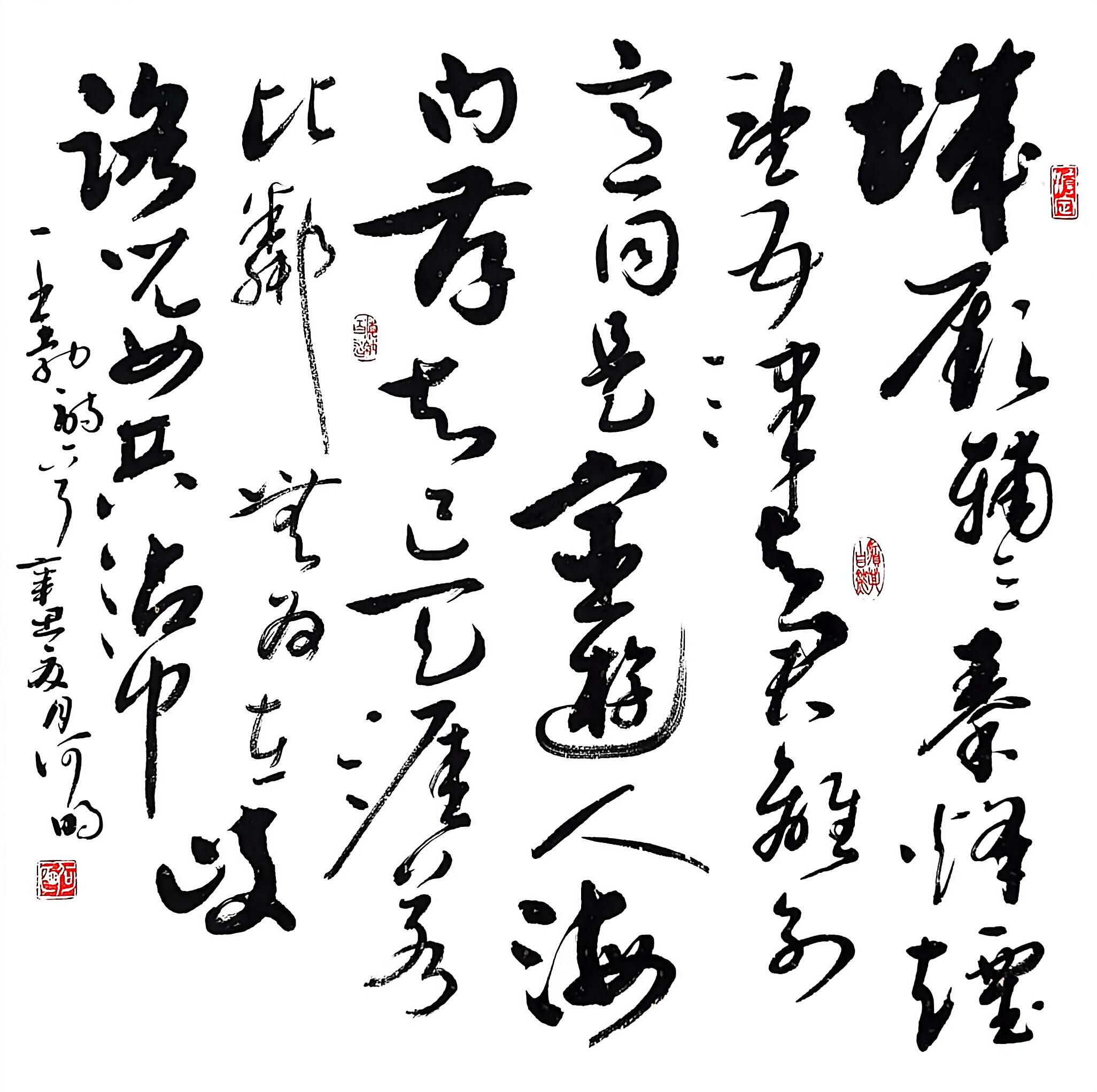在书法创作上,何明深耕传统又勇于创新,博采众家之长,将历代名家笔韵与自身风格相融,形成了兼具传统韵味与个人特色的书风。他格外注重作品的内在气韵,精准把控笔法、墨色、章法,平衡传统与创新、刚与柔、虚与实的关系,让笔墨层次丰富、意境悠远。