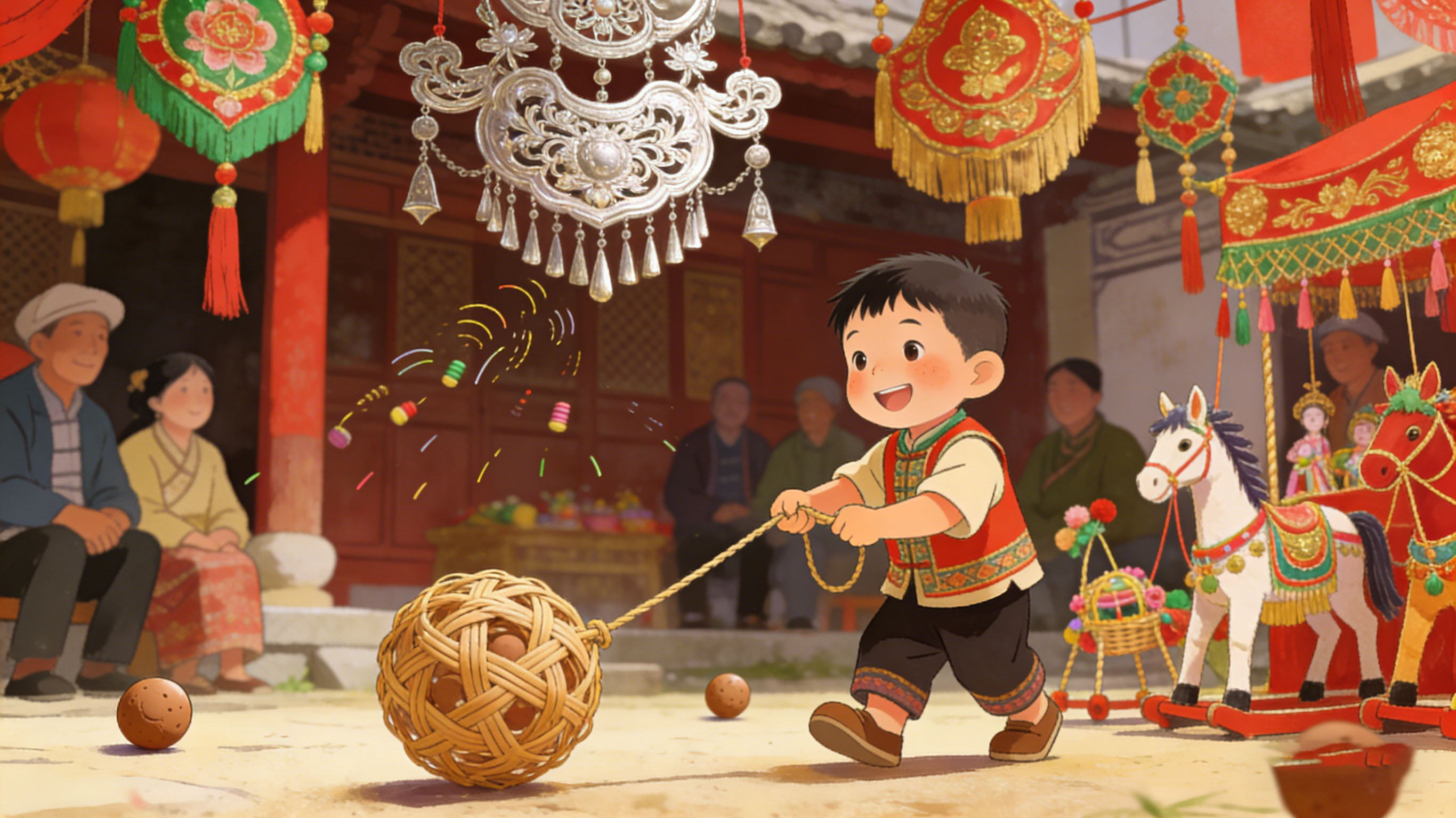 剑川聚,布银扎彩雕花脆。雕花脆,泥丸入韵,索儿摇碎。苏梅纸马酸眸会,稚儿笑扯藤编戏。藤编戏,观摩摄尽,千年春味。