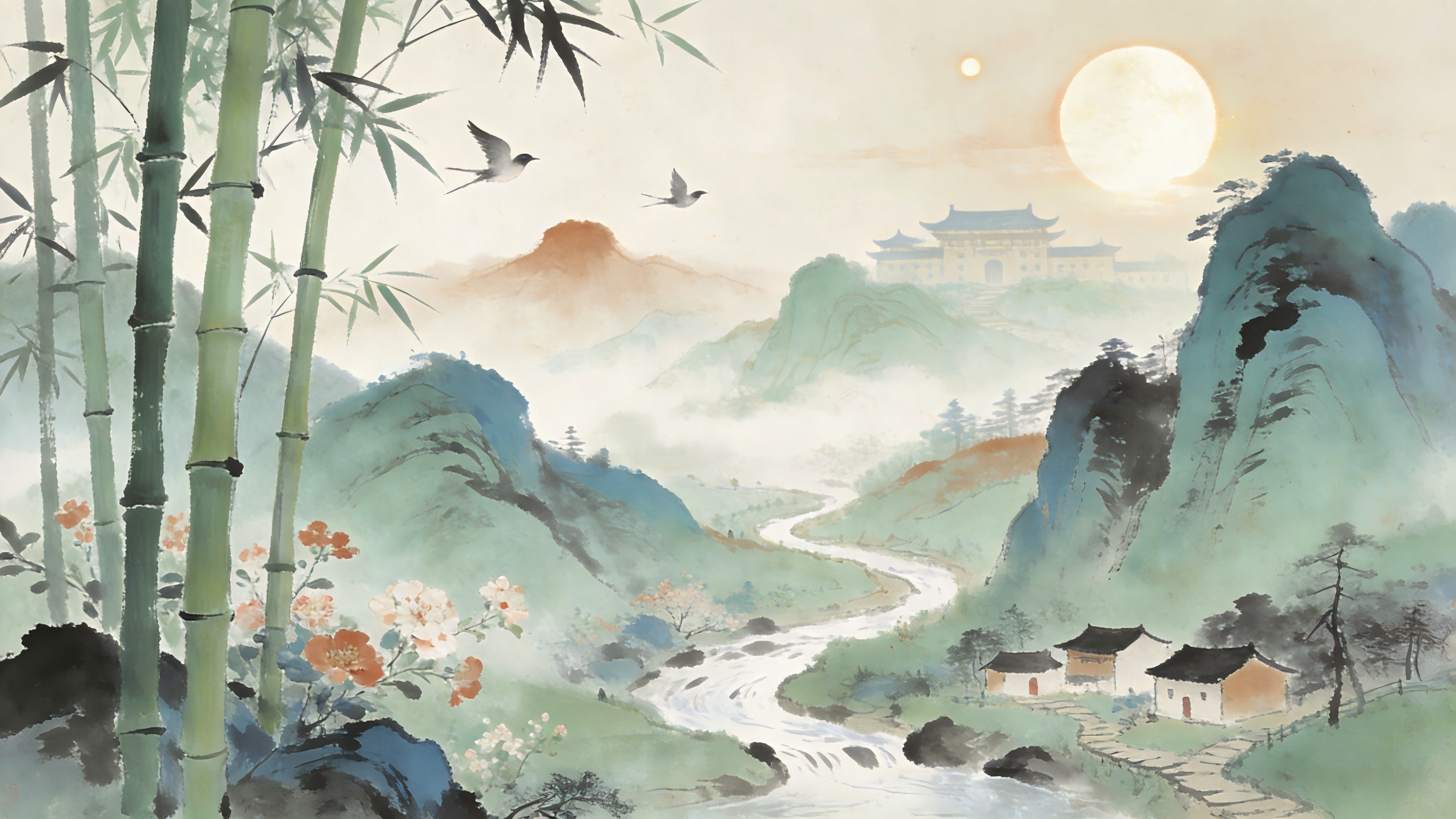 飞流随鸟唱,曲径伴花闲。