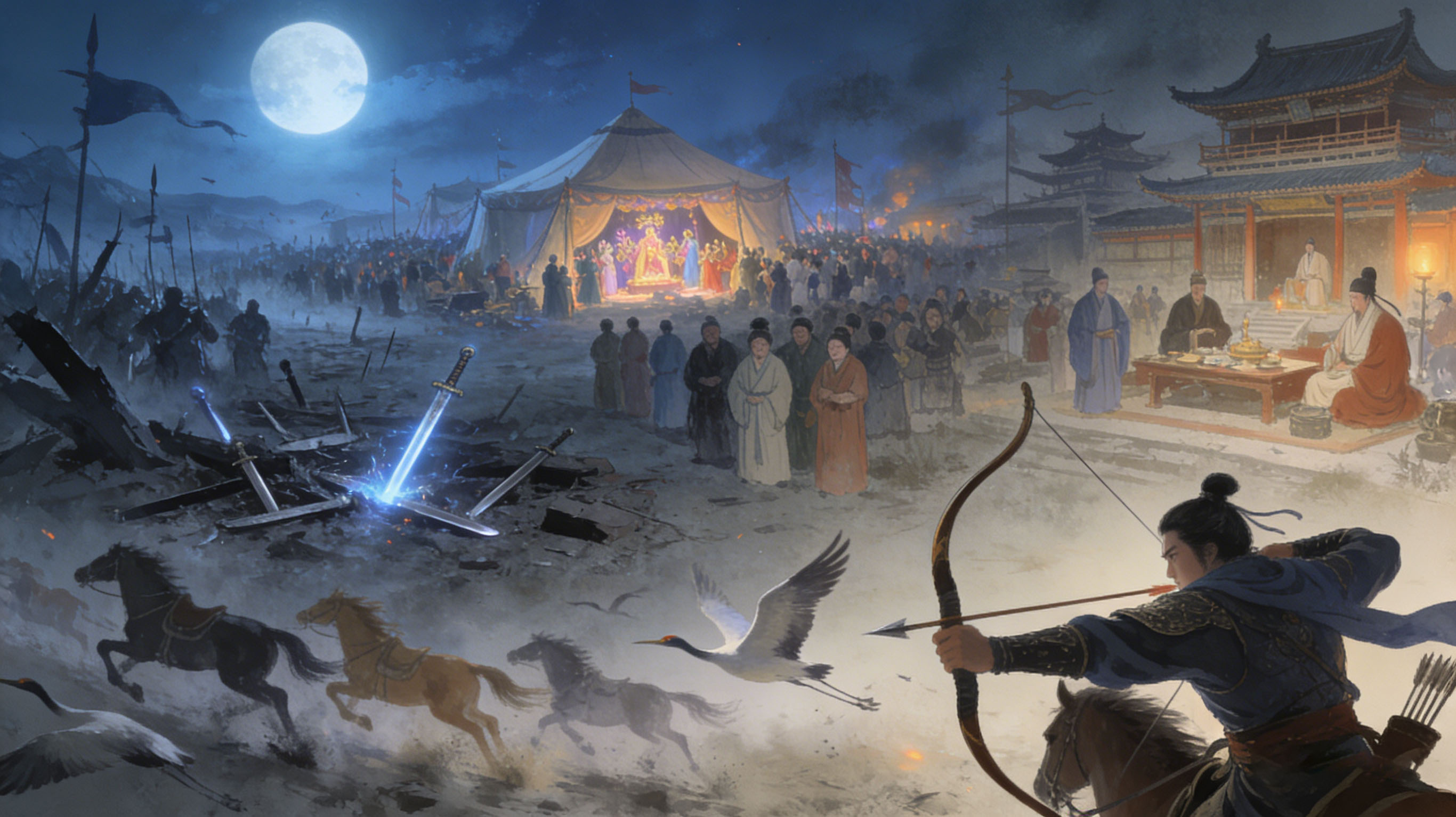 刀剑寒光凝月色,笙歌艳影乱边荒。
