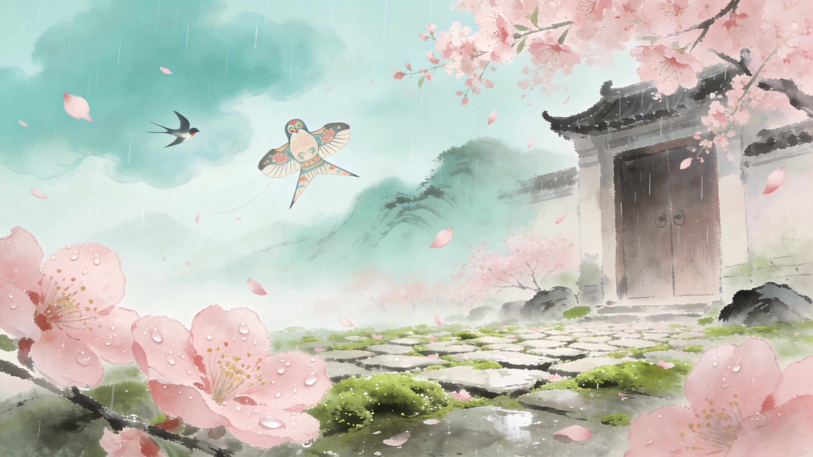 桃雨沾衣香欲染,纸鸢斜拽碧云痕。