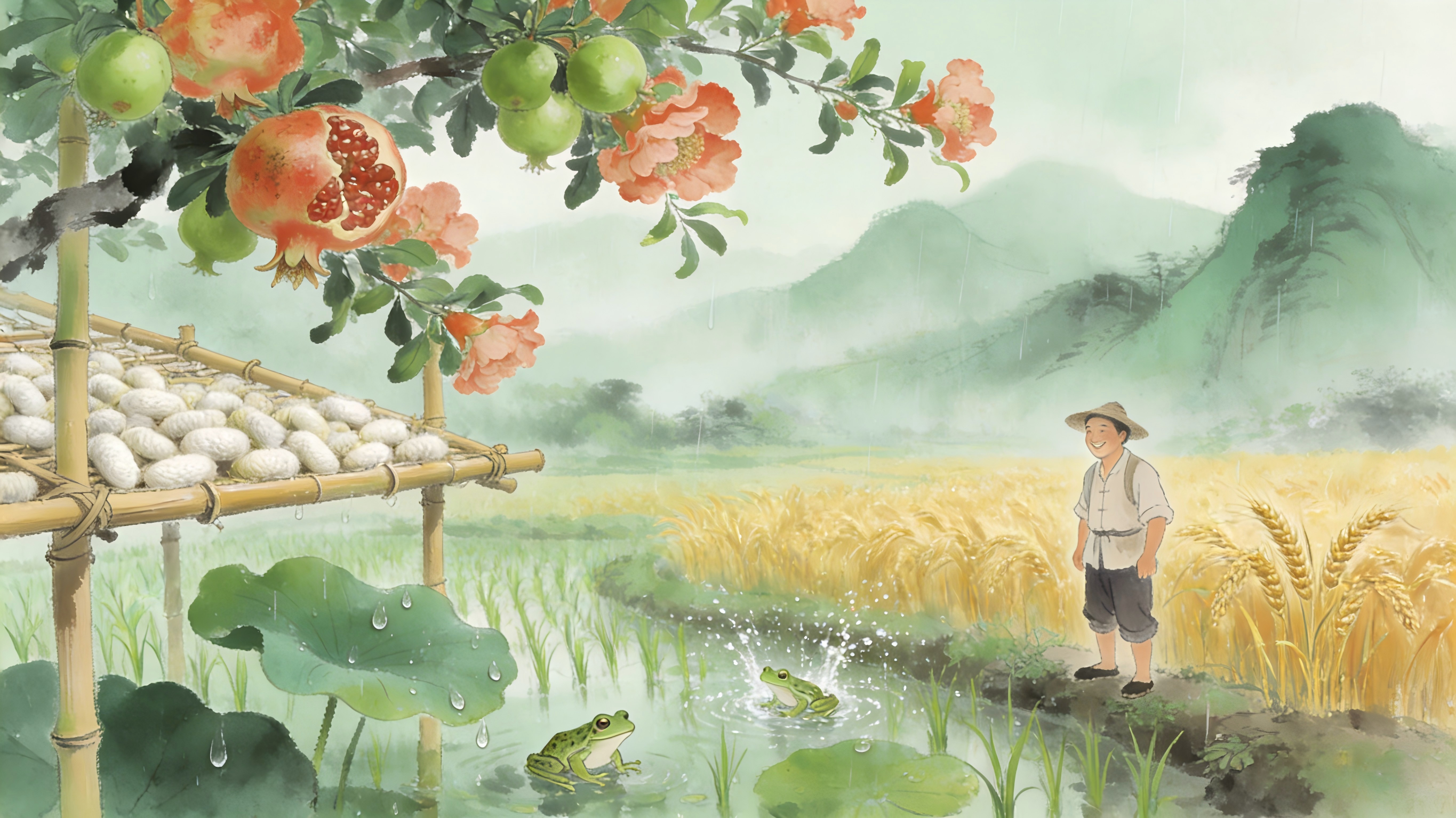 蛙鼓喧稻畦,雨滴敲荷朵。麦浪翻金穗渐沉,笑在眉弯卧。