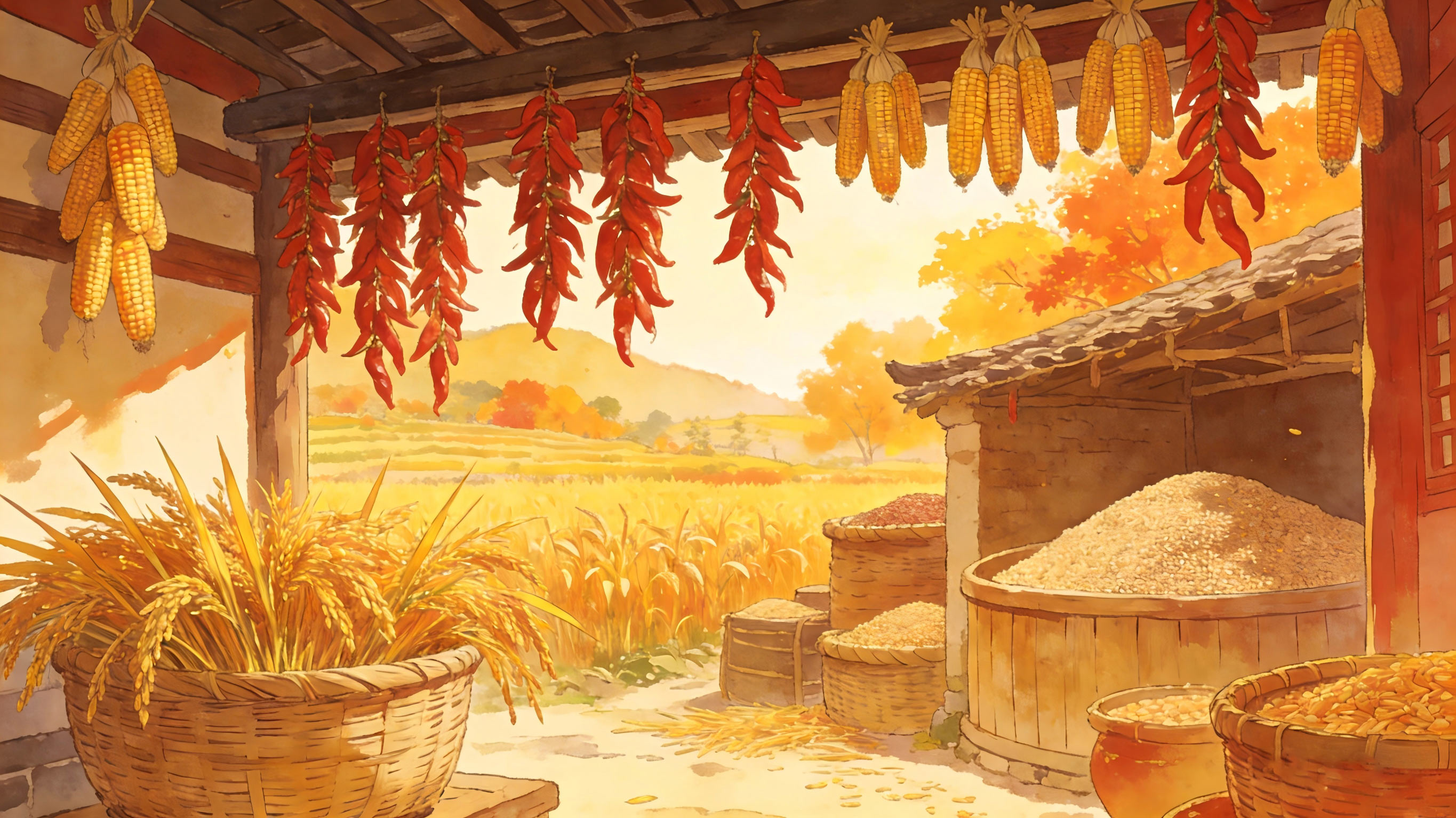 红椒串,玉米挂房梁。稻穗金黄筐硕果,田园秋色谷盈仓,铺彩淡浓妆。