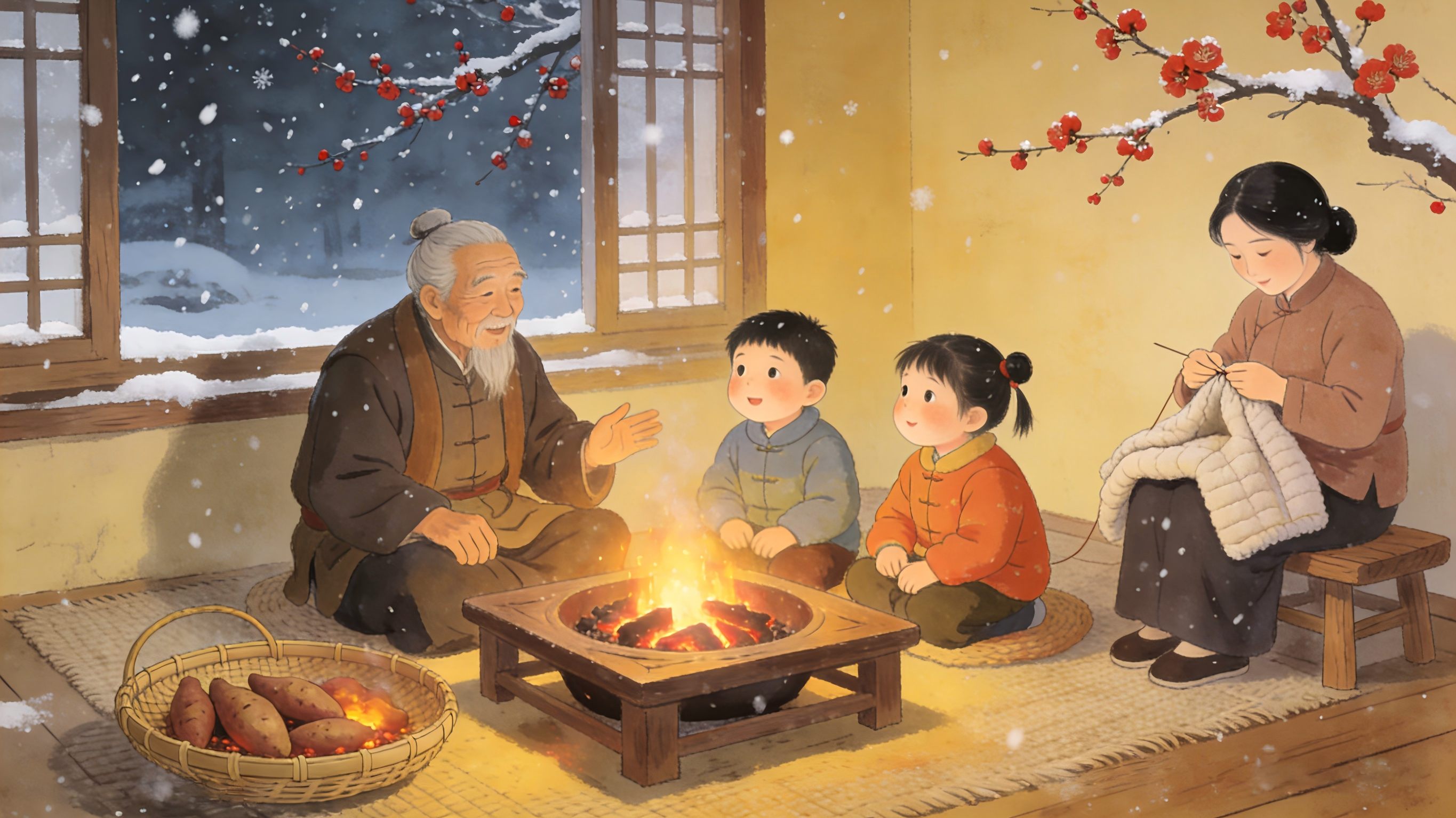木碳盆燃暖小房,周边烤薯熟凝香。