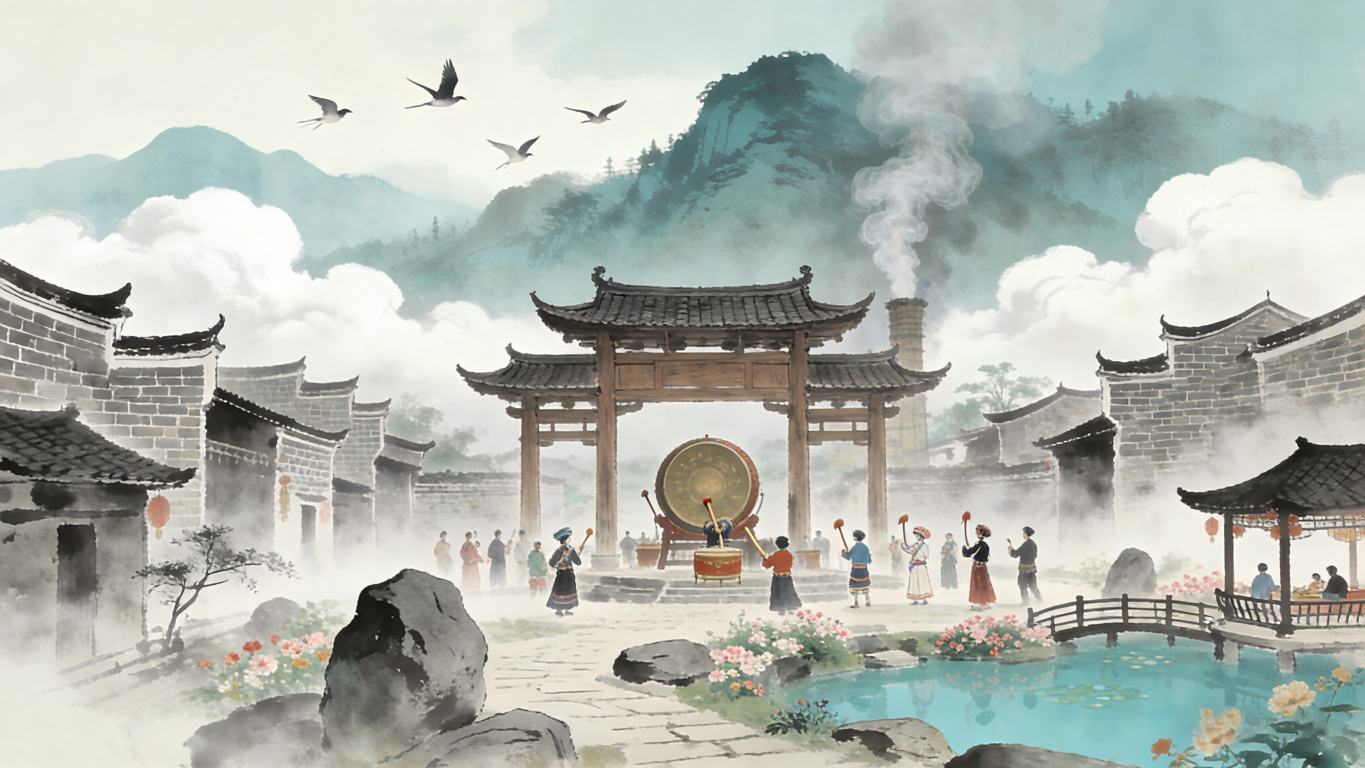 古肆青砖晓雾寒。白云缭绕鸟声欢。牌楼屹立见炊烟。