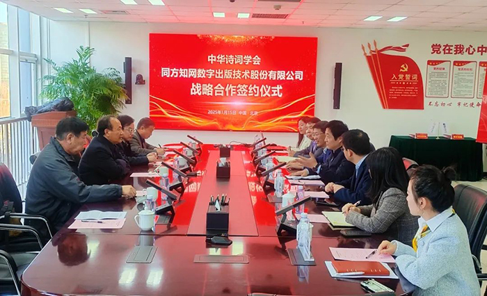 1月15日下午,中华诗词学会与同方知网在知网总部举行战略合作签约仪式。中华诗词学会会长、原国家行政学院副院长周文彰,同方知网总经理张宏伟,中华诗词学会常务副会长林峰、副会长刘庆霖、秘书长杭中华、网络部负责人张伟超,同方知网党委委员、副总经理肖宏,同方知网党委委员、互联网平台事业部总经理刘艳军,市场开发部总经理周萌枝出席签约仪式。同方知网党委委员、副总经理柯春晓,中华诗词学会副会长刘庆霖代表双方签约。双方通过签订战略合作协议,旨在发挥各自优势,协作共赢,共同推动中华诗词的文化传承与数字传播的融合发展。