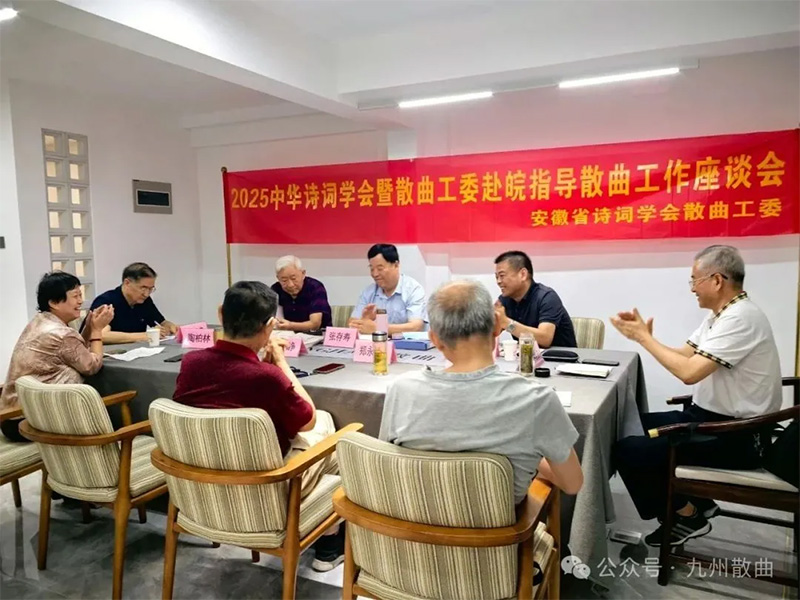 张存寿、徐耿华出席了安徽省诗词学会散曲工委在合肥散曲艺术空间召开的安徽散曲工作座谈会。安徽省诗词学会会长邹志高,中华诗词学会散曲工委副主任、安徽省诗词学会散曲工委主任郑永钤,副主任兼秘书长董静、副主任周棣、张曙生、陶柏林、顾问苗干忠等参加并先后发言。郑永钤、董静全面介绍了安徽省自2015年12月成立散曲组织以来的发展情况和取得的成就。邹志高会长充分肯定了安徽散曲工委的工作,他说:安徽散曲是我省诗词最亮丽的文化艺术风景,安徽散曲为安徽的诗词文化做出了卓越的贡献。省诗词学会将一如既往的关心支持安徽散曲的工作。