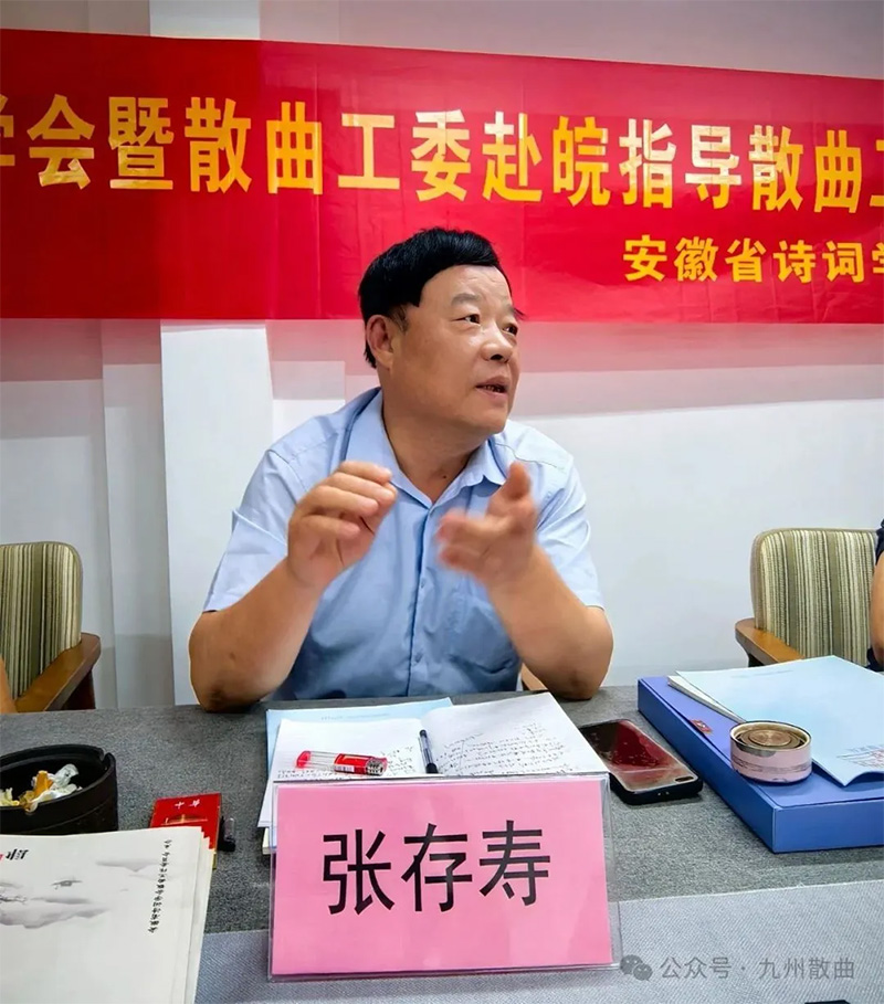 张存寿副会长对安徽散曲工委的工作给予充分肯定,他说,安徽散曲组织成立以来,在省诗词学会领导下,郑永钤会长带领大家立足安徽,面向全国,建队伍、办刊物、建基地、搞活动,办赛事,出专著,出精品,获大奖,队伍发展到430余人。成就斐然,硕果累累。特别是2023年新班子上任以来,安徽散曲翻开了新的一页,以崭新的姿态活跃在当代散曲舞台上,取得了可喜成绩。不管从创作队伍还是创作质量都迈向了全国散曲的第一梯队。他希望安徽散曲工委能进一步凝聚骨干,扩大队伍与平台;增强精品意识,把安徽散曲创作推向新的高度;立足安徽,辐射全国,进一步扩大中华散曲的影响力和服务功能。并表示作为中华诗词学会分管领导,将全力支持安徽散曲工作。