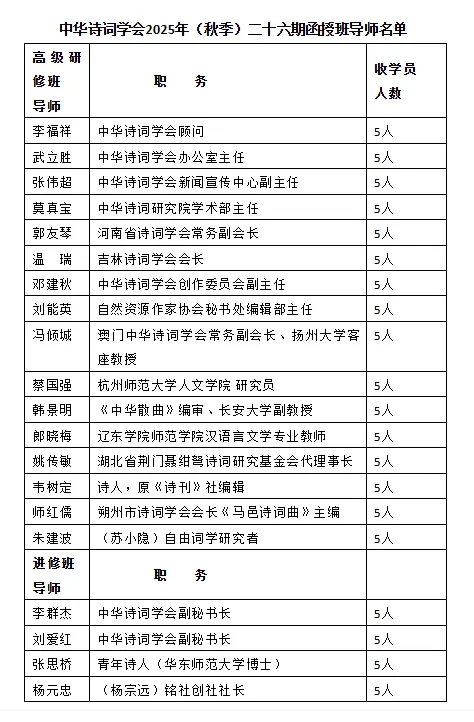 中华诗词学会诗教培训部举办2025秋季函授班(第二十六期)招生,即日起办理报名手续。