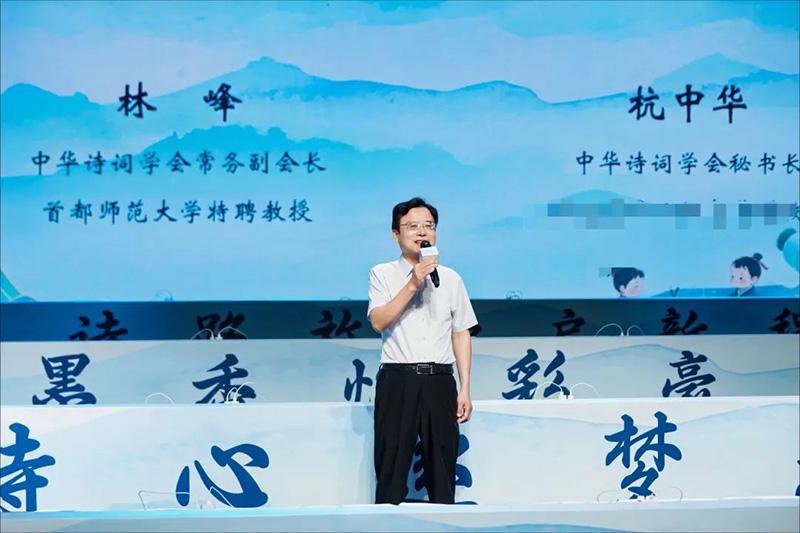 中华诗词学会常务副会长林峰首先致辞。林峰代表中华诗词学会、代表周文彰会长向“出口成章、诗词少年”活动总展演的成功举办表示衷心祝贺。他说,这方舞台星光璀璨,我们共同见证了诗词少年们的风华正茂与“出口成章”的非凡风采。你们用青春的激情,唤醒了沉睡千年的平仄韵律;用清澈的声音,演绎了跨越时空的家国情怀与生命哲思。林峰说,在胜负之外,让我们看到了更珍贵的景象:那是中华优秀传统文化在年轻一代心中深深扎根、蓬勃生长的生命力!诗词,是我们民族精神的源头活水,是文化自信的深厚根基。这份源于经典的滋养,必将成为你们未来人生路上最宝贵的财富,远比任何奖项都更加恒久、深远。
