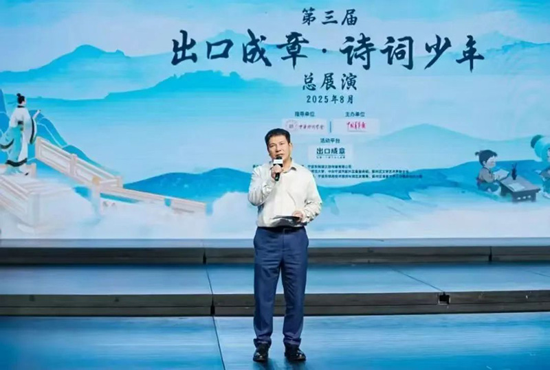 “出口成章”平台创始人、大连厚仁科技有限公司董事长吴建宁先生在颁奖典礼上发表了致辞。他首先向所有获奖选手表示热烈祝贺,并深情阐述了诗词与少年的深刻联结:“诗词为少年的成长铺就了文化底色,而少年的灵动与朝气,又让沉睡的诗句有了跳动的生命力。 这正是传统与青春的双向奔赴,是文化传承最鲜活的模样。”