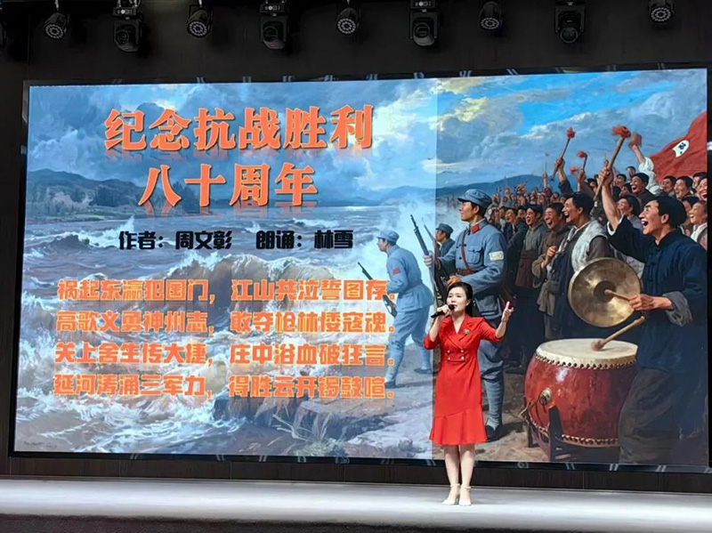 随后的诗词朗诵会宛如一部荡气回肠的抗战史诗。朗诵艺术家们和歌唱家声情并茂地演绎了14首经典抗日战争时期的抗战诗词及3首抗战主题歌曲。朗诵艺术家再现了赵尚志将军在《水调歌头》中“忍辱卫家邦,洒血不彷徨”的坚毅誓言,诵出吉鸿昌烈士在《就义诗》中“恨不抗日死,留作今日羞”的豪情壮志,呈现了老舍、郁达夫、柳亚子等文人志士的忧国之作,演绎了佟麟阁将军“誓将七尺躯,殉此一腔血”的《无题》诗篇,诵出中华诗词学会会长周文彰在《纪念抗战胜利八十周年》中的对中华民族不屈的精神及胜利后的喜悦。市朗诵协会副会长袁辛平压轴朗诵了朱德元帅《太行春感》“忠肝不洒中原泪”的肝胆气节与毛泽东主席《沁园春·雪》“欲与天公试比高”的磅礴气魄,将现场气氛推向高潮。廖爱真等三位著名的歌唱家倾情演绎,唱出《松花江上》的悲怆与控诉、《九儿》的韧性与倔强、《毛主席的话儿记心上》亲切与坚定,均以音乐的力量深深感染了全场。