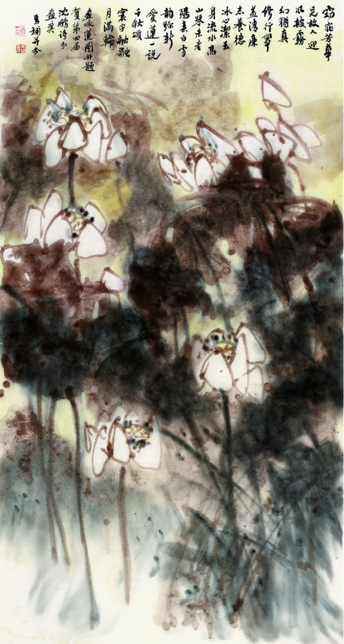 马骕 《画〈咏荷图〉并题七律 贺第四届“沈鹏诗书画奖” 》 纸本设色 180cm×97cm