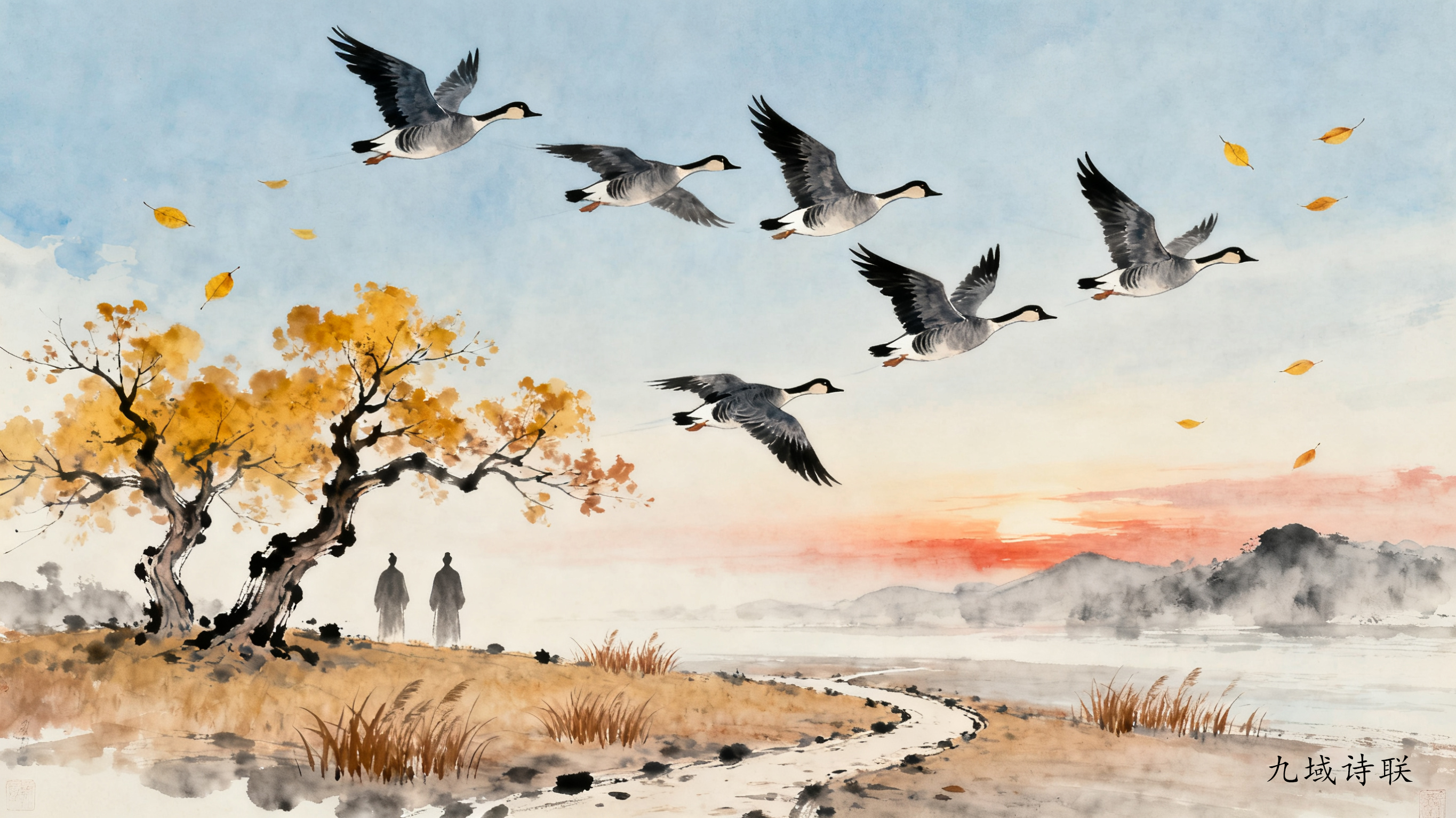 山青水澈, 北雁南征,一羽傲云天, 彩韵飞扬风送爽;