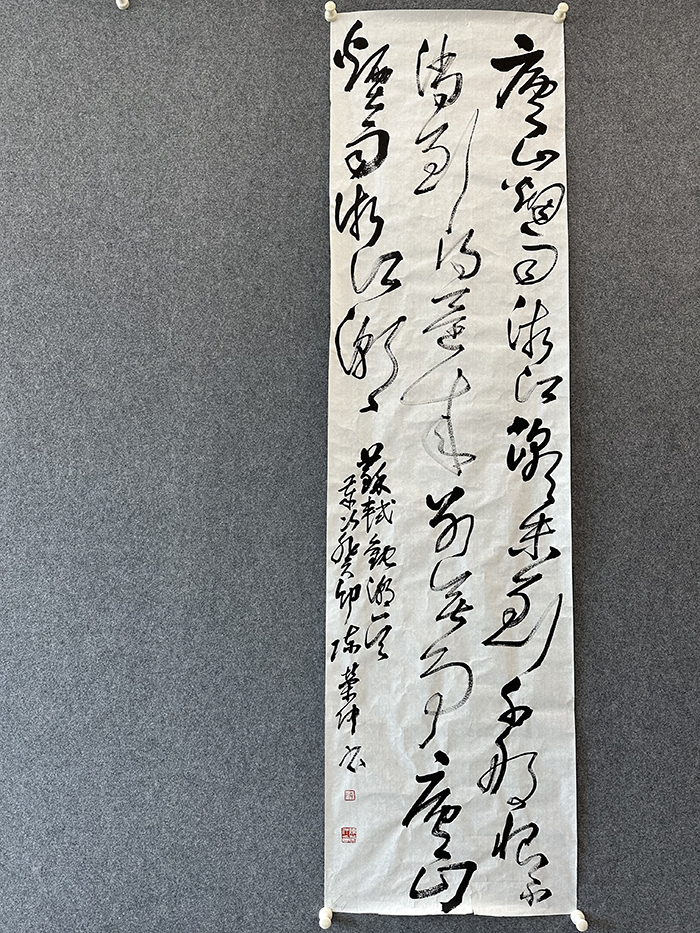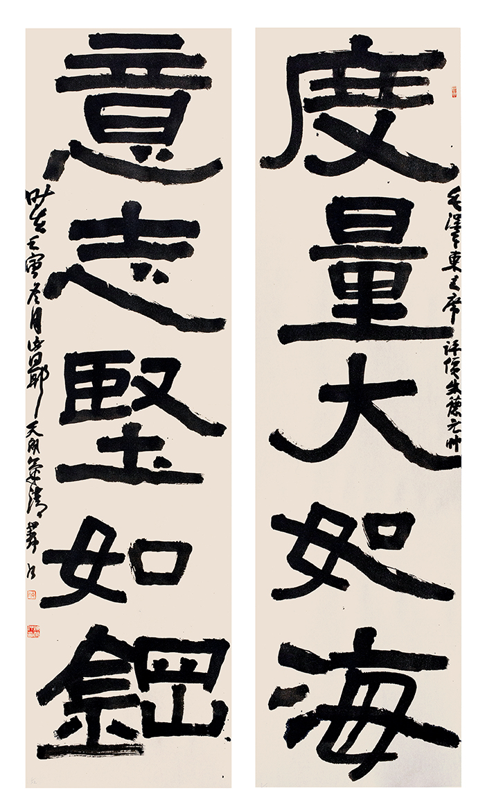 书法艺术作品应兼收并蓄。我个人喜好米芾、祝允明、张瑞图、倪元璐,特别是王铎书法风格的作品。我崇尚跌宕欹侧之美,喜欢米字跳荡多变的结体,变其刷字中常用的侧偏锋为中锋,行笔凝重、笔势翻澜、落笔凝练,单字和字组的结构重组,欹正的交替进行,减弱变化的突兀,变“一泻千里”为“抑扬顿挫”,使作品在跌宕欹侧的变化后依然具有起承转合的合理性,使笔法、结体、章法更科学,气格品性更具教养,表现出苍浑劲健的艺术效果,这种始终贯穿着矛盾对立统一的平衡,是我一直以来的艺术追求。