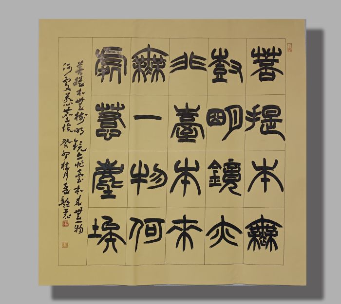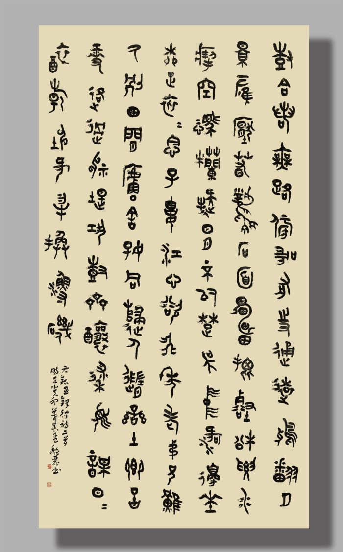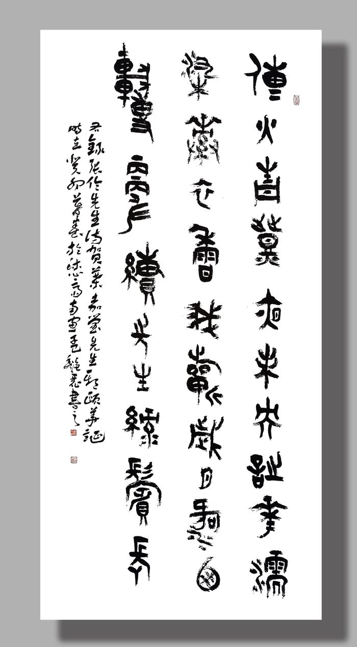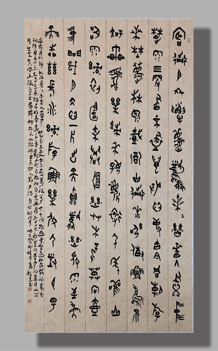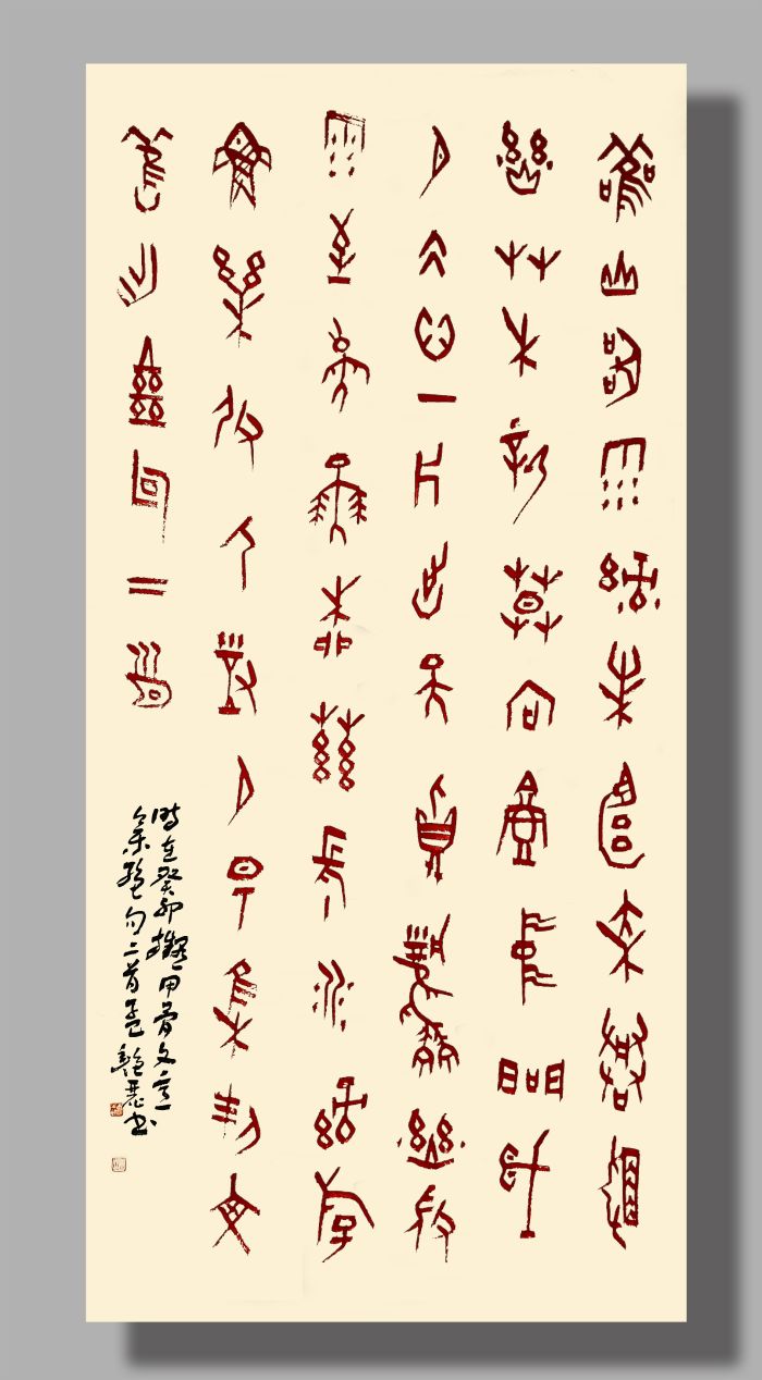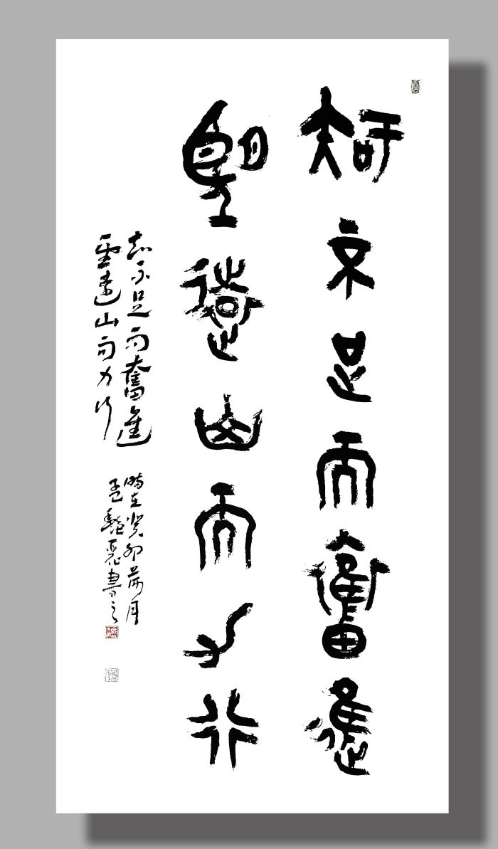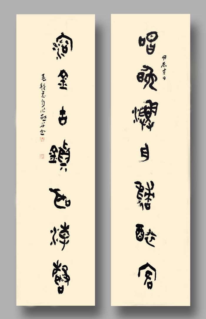 和古文字结缘,便有无言独上高楼之感,学习古文字需要尊重传统,敬畏传统,上下求索。上溯甲骨求源,寻觅六书中的“镜像构字正反不别”、“同类混用”“辅件省变”“黏合构字”等构字规则,贯通字理,追求精准用字之难题。还尝试以自作诗联进行金文创作。