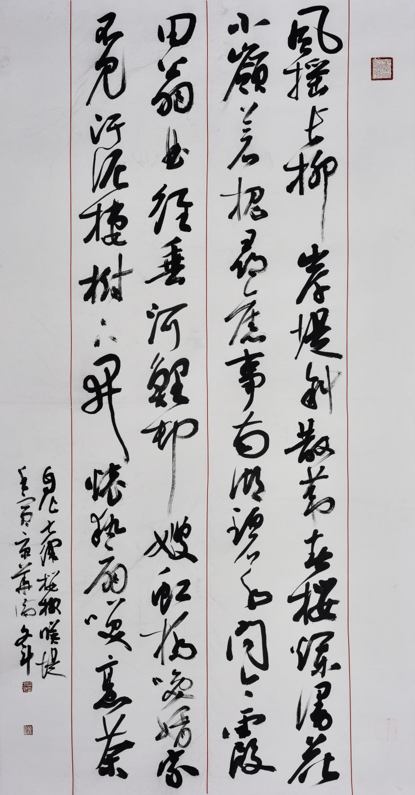 满文斗诗书兼善,这几十幅书法作品全部是他自己的诗词楹联作品,这是非常难能可贵的。在华夏文化的瑰丽画卷中,书法与诗词楹联都是璀璨的明珠。它们同为艺术的表现形式,却有着不同的表现力和魅力。然而,在满文斗这些诗词楹联与书法之间的关系,并非独立存在,而是相辅相成,相互影响的。
