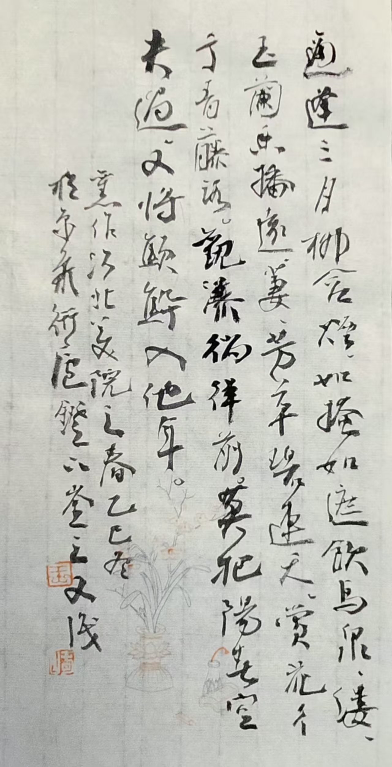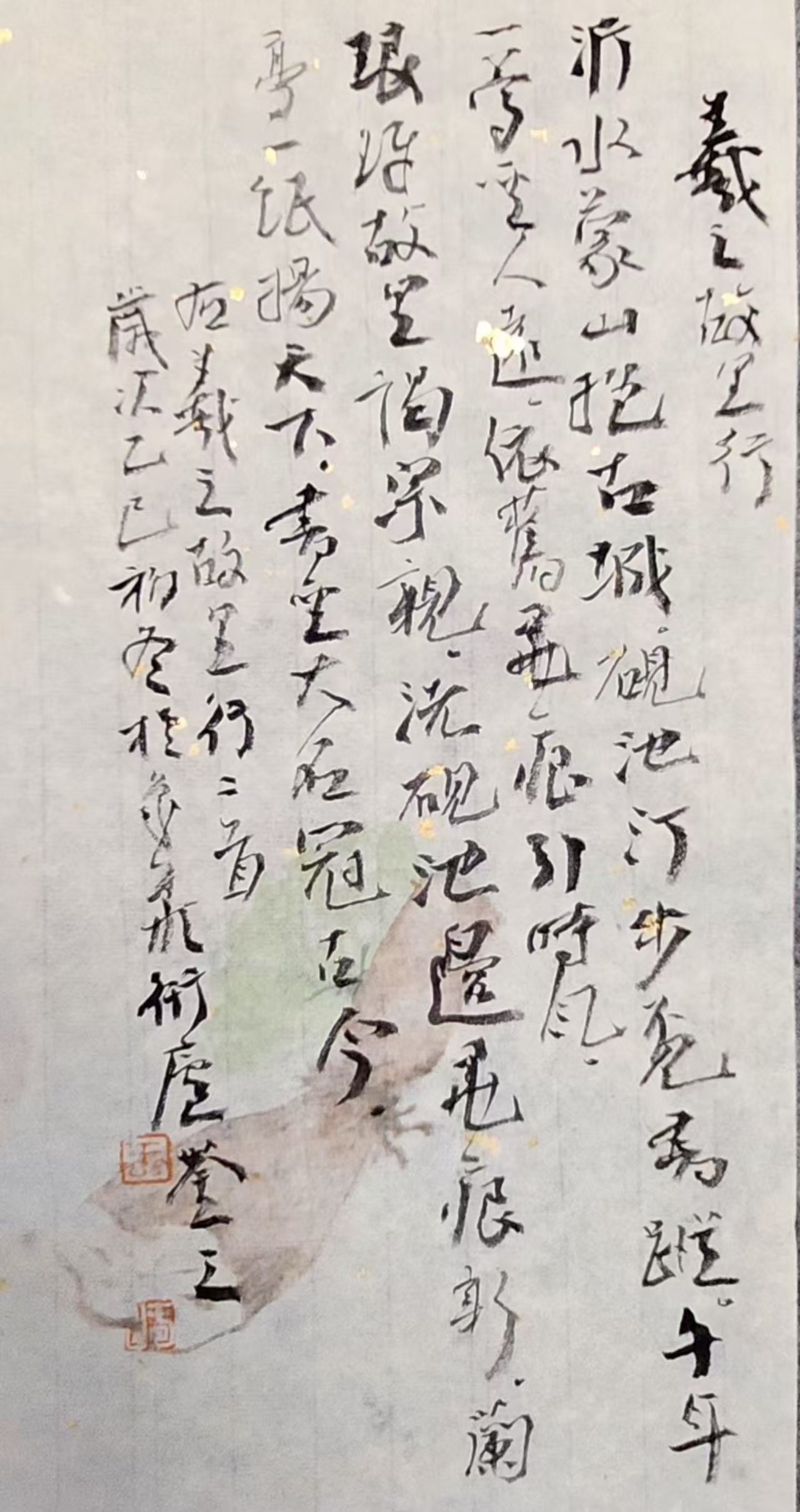 甲辰岁春,余客河北美院,课余,信步青藤路,听黄鹂啾啾,闻玉兰郁郁,赏芳草芊芊…青藤路与右军交汇旁有饮马泉,水清洌,泉四周翠柳以抱,蒹葭以环,前行百步,见忠义堂,堂东有紫云瀑,瀑流细,往返其间,如步桃源,然阳春易逝,叹岁月之蹉跎,有感于此,惜哉…